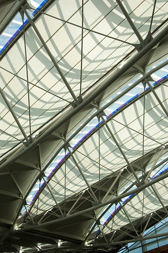 These four sculptures were created from translucent white silicone coated fiberglass material stretched over a metal frame and inserted within the truss structure of the skylights, 70 feet above the floor. The design of the four 180 x 30-foot sculptures was inspired by the construction of the Wright brothers’ first airplane, and also recalls dirigibles, or boats. The sculptures are functional in that they diffuse direct sunlight from the skylights, reflect light up onto the opaque surface of the roof, and project a dappled play of light into the space.