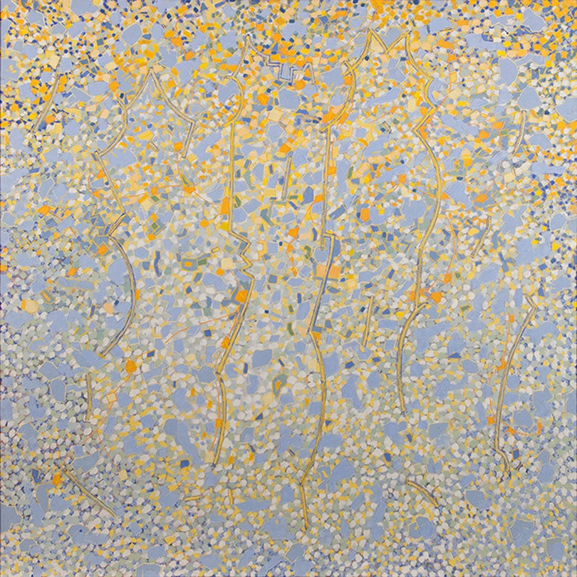 Lee Mullican’s paintings reflect the influence of his interest in and study of Native American art and culture. He evokes ritual and myth with his ornate, mosaic-patterned surfaces.