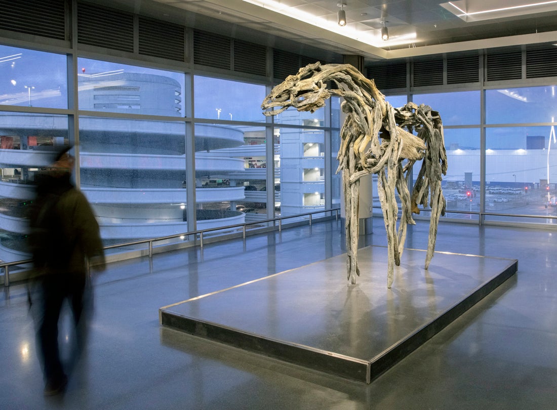 Deborah Butterfield’s fascination with horses began as a young child and has remained her artistic focus since creating her first equine sculpture as a graduate student at the University of California, Davis. Originally serving as a metaphorical substitute for her, Butterfield viewed the form as a personal feminist statement saying, "I wanted to do these big, beautiful mares that were as strong and imposing as stallions but capable of creation and nourishing life.” Pohina was first constructed from found driftwood then cast in bronze and given a patina that identically mimics the source material.