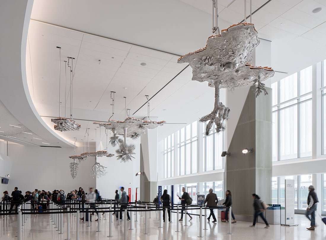 Terra-Techne consists of six suspended “tectonic plates,” each representing a different continent. From the departures level, passengers look up to see multiple iconic California landscapes suspended from the underside of each continent. From the mezzanine level, the viewer looks down on a different visual narrative; each continent is topped with a terra cotta “circuit board.” Each circuit board depicts a different design in the evolution of the silicon chip. The artwork is a monument to technological innovation and organic connectivity. In this inverted landscape, technology replaces the root network of the plant, symbolically becoming the source of growth and connectivity in the digital age.