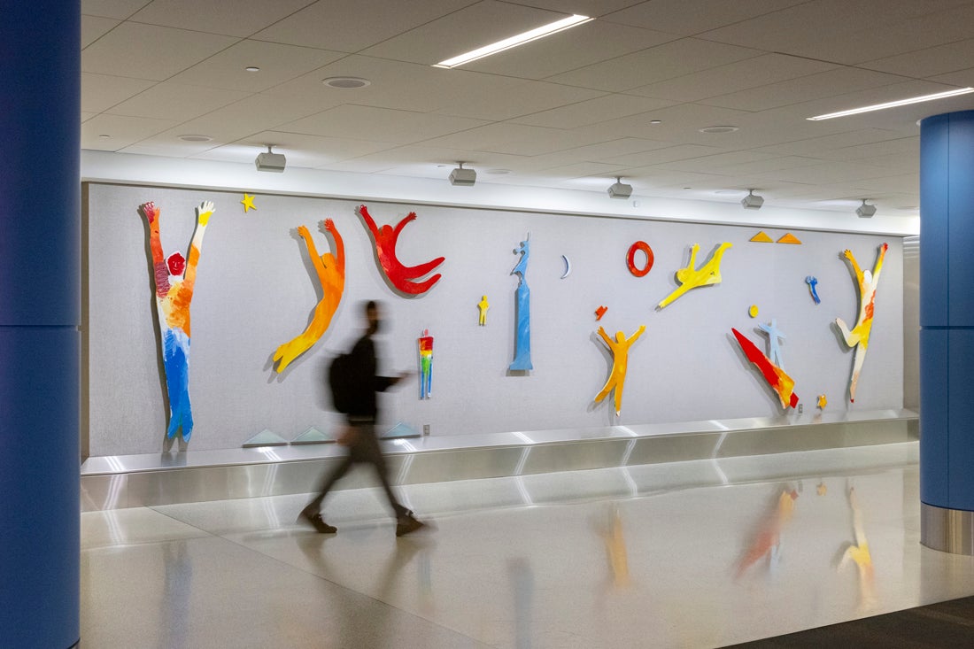 A series of exuberant, waving figures and depictions of San Francisco landmarks highlight the wall piece, designed to greet and welcome visitors from around the world.