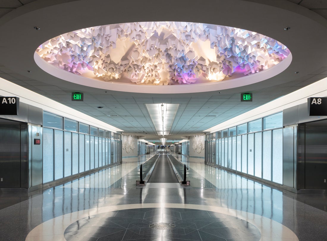 A ceiling dome, installed at one end of the corridor and lit through blue gels, is inspired by early creation myths that describe the sky as originating from ice crystals. On the floor below the dome are bronze and terrazzo medallions. As passengers pass through the dome and walk along the corridor wall, they encounter five 60-foot long curved niches. In these niches, groups of cast hydrocal tiles with forms derived from the mathematical theories of English mathematician Roger Penrose, are fitted together to create shapes that resemble clouds. The artist created these complex forms using only two unique shapes of tiles.