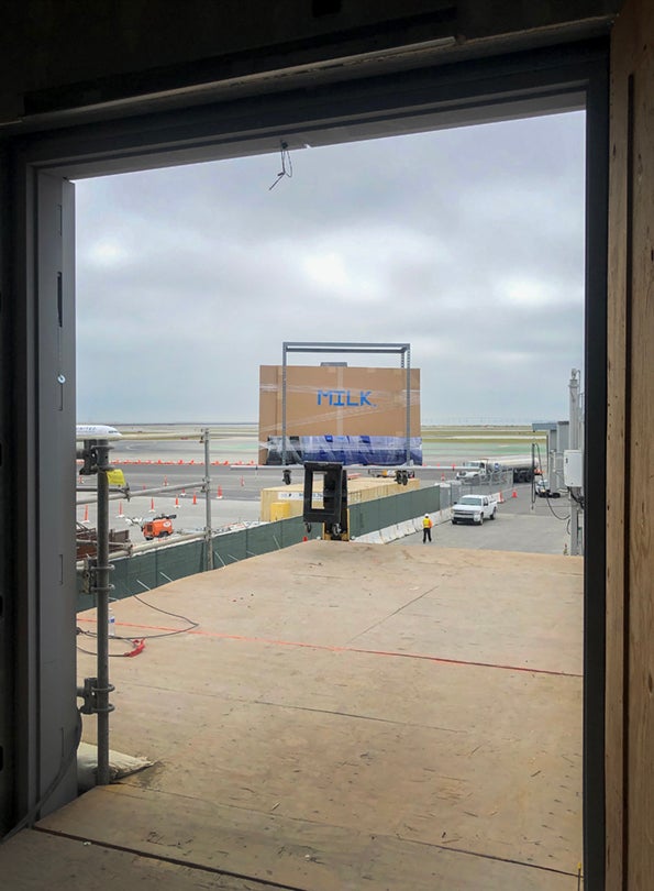 Because the exhibition needed to be installed before the Terminal opened to the travelling public, installation would need to occur while the area was still a live construction zone. This presented a number of logistical considerations during the installation process. First, everyone involved with the installation of the exhibition would need to attend safety training courses, adhere to OSHA worksite guidelines, and wear full PPE while on site. Additionally, all deliveries to the construction site would need to be scheduled in advance to be delivered via the airfield and would need to be inspected by Airport duty managers and then escorted to the equipment loading zone. We were sharing this single loading zone with every other contractor and vendor working on the Harvey Milk Terminal 1 construction site. We were given fifteen-minute time-slots and could not be late! All tools, scaffolding, lifts, artwork, etc. would need to be packed in order to be lifted via a Gradall onto the second floor of the Terminal and would then be transferred via carts to the exhibition wall at the far end of the Terminal—a brisk ten-minute walk in each direction.