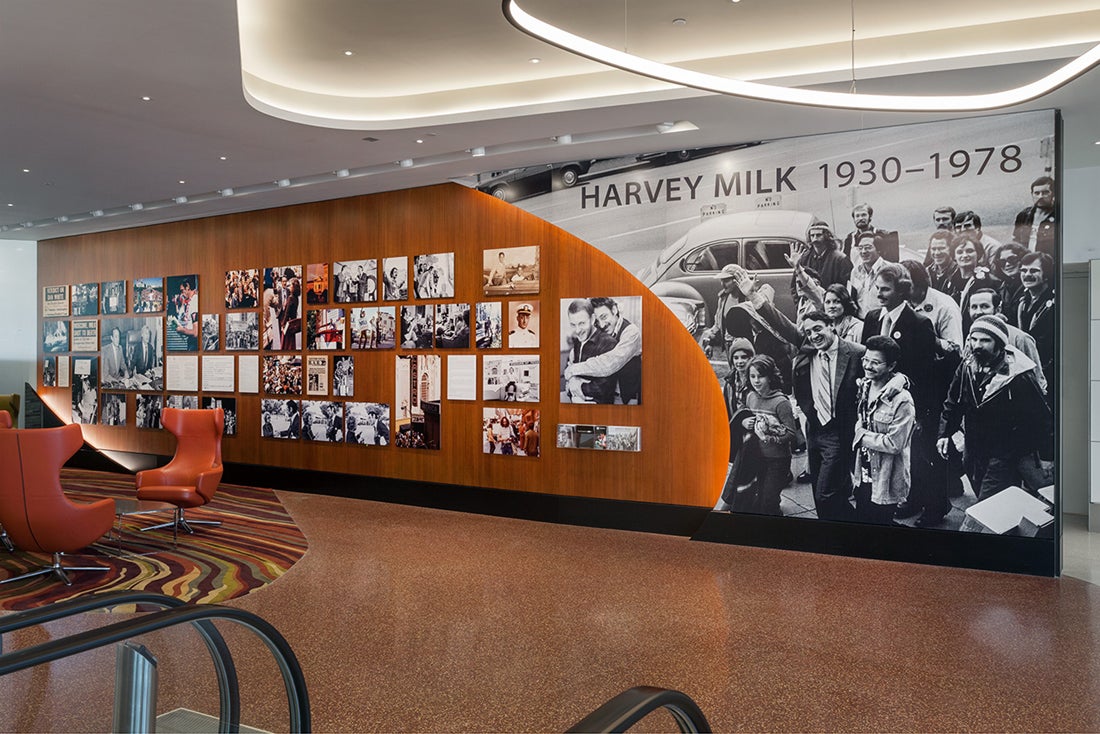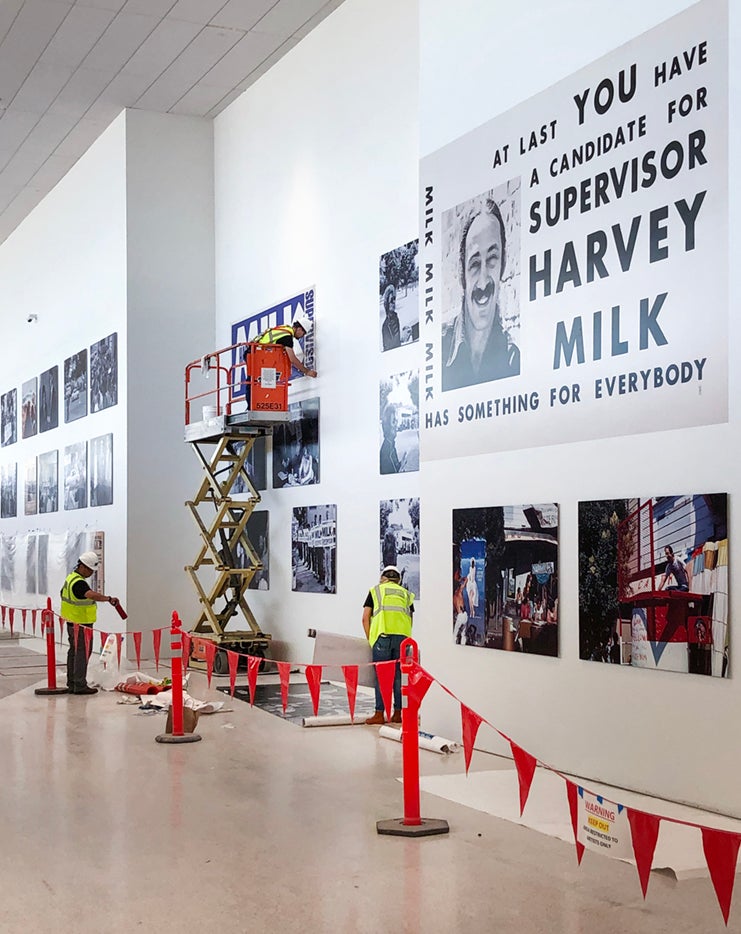 In 2017, the Museum’s curatorial team was informed that Terminal 1, which was at that point undergoing significant renovation, would be dedicated and named in memory of Supervisor Harvey Milk upon its first phase of reopening in 2019. The Airport had identified a large-scale wall—400 feet in length and visible to all passengers entering or leaving the Terminal—to be reserved for an exhibition dedicated to the life and legacy of Harvey Milk and requested the Museum’s involvement in the project.