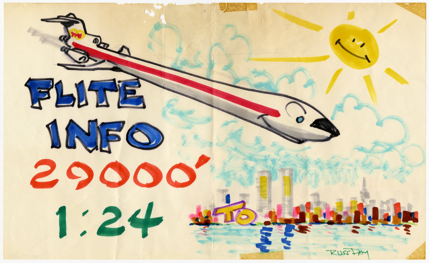 For a closer look at some of the creative minds who promoted TWA on a more localized level, we turn to former flight attendant Reneé Schaukowitch, who graduated in 1973 from Breech Training Academy, a flight service school operated by TWA in Overland Park, Kansas. Pictured here standing in front of a Boeing 707 at Lambert–St. Louis International Airport (STL), Schaukowitch saved a pair of cartoons drawn in felt-tip marker by her fellow crewmembers to greet boarding passengers at the door. Proudly displaying their team colors, the bug-eyed jets flash wide grins like lovable mascots amped up on a full tank of cheer.