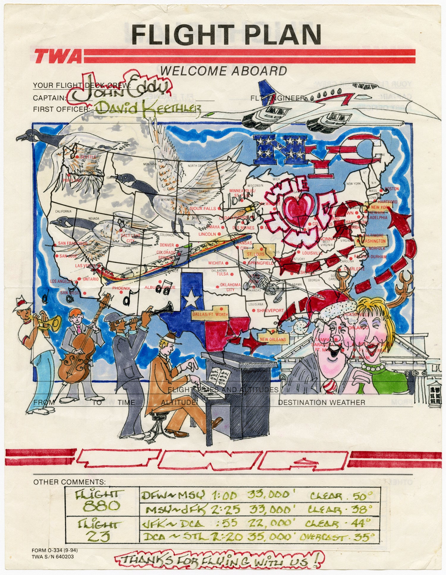 Trans World Airlines (TWA) flight plan illustrated by Captain John Eddy 1995