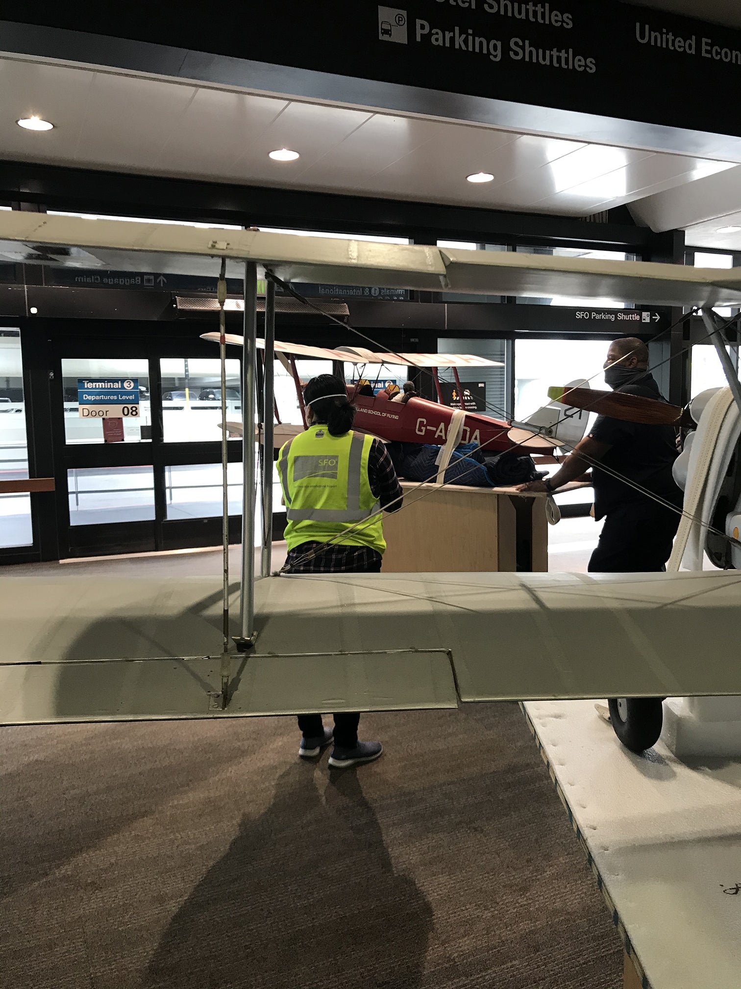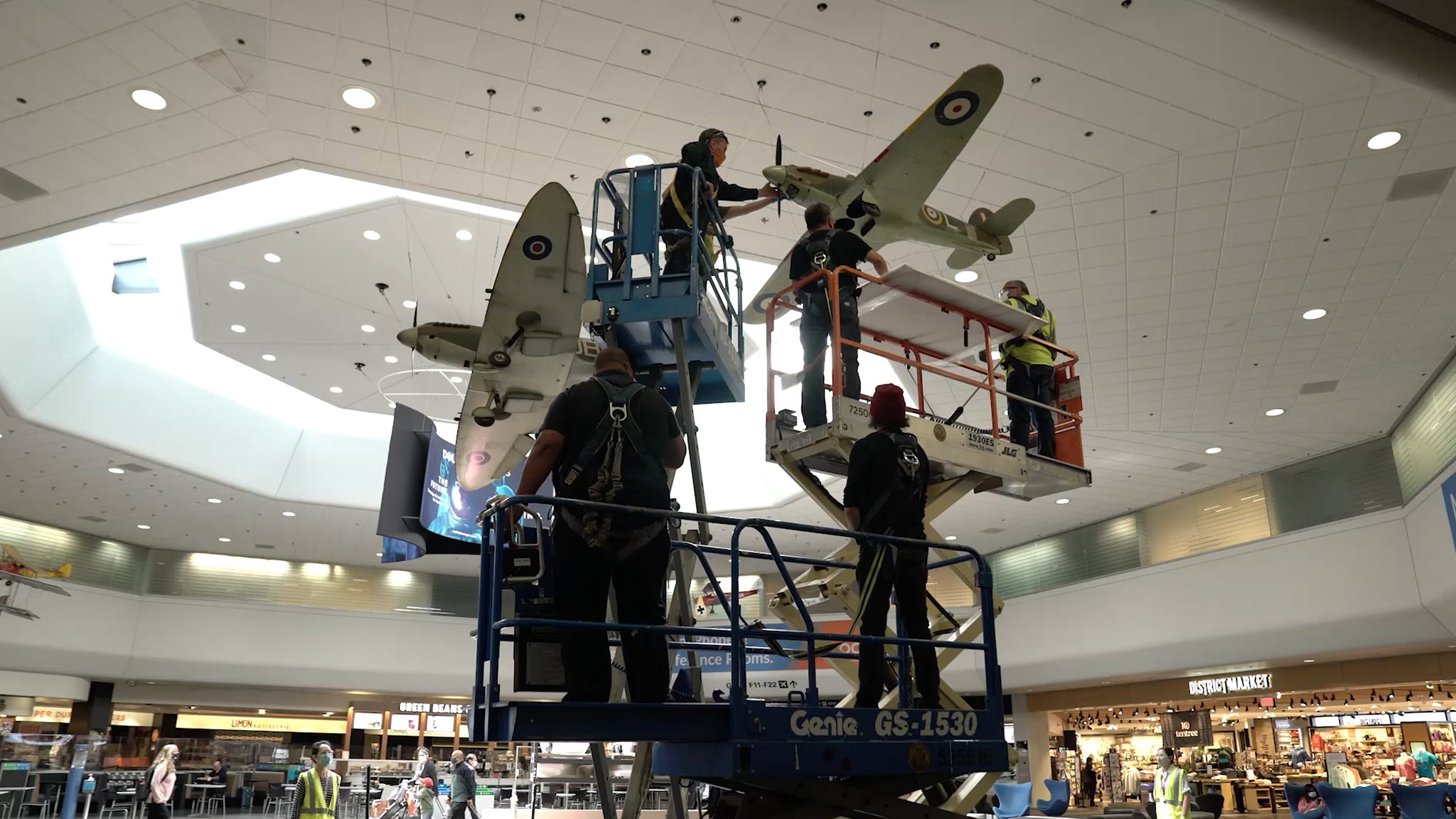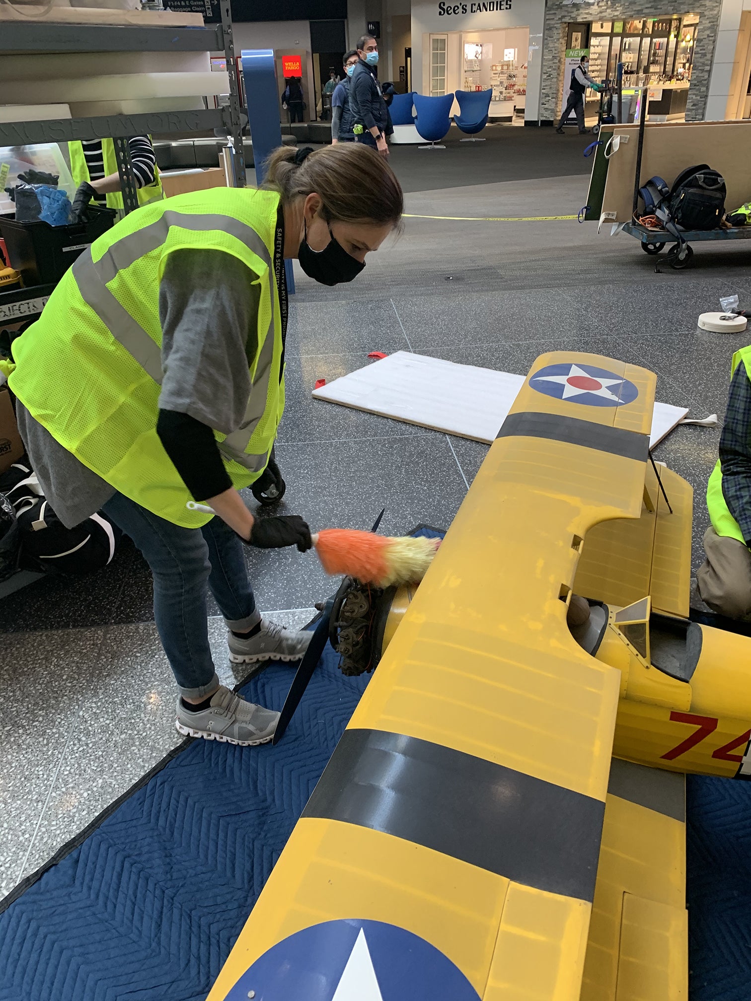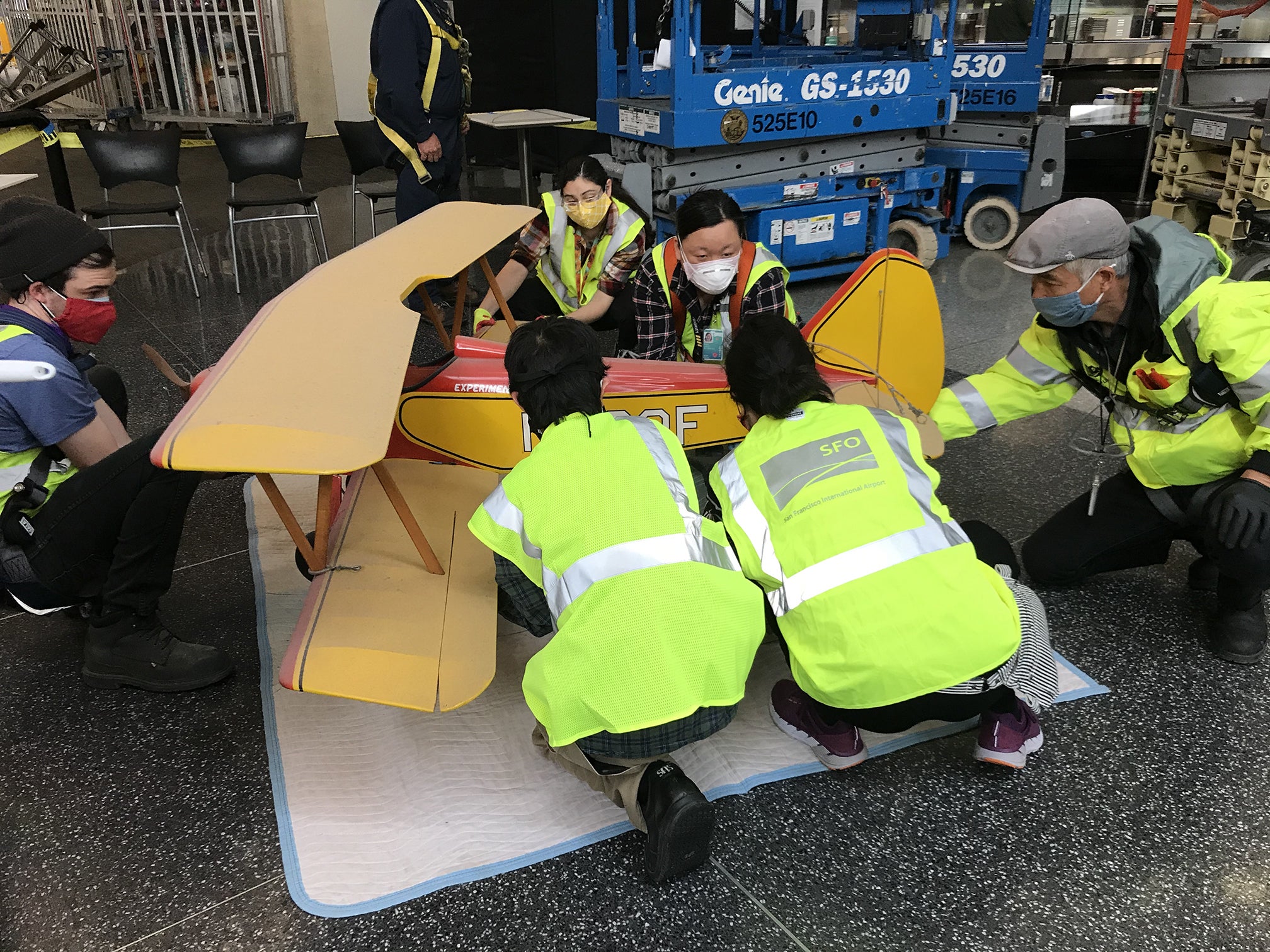 Recently, we were tasked with the takedown of eight of the Museum's largest model airplanes from the hub ceiling of Terminal 3. As a museum embedded in an airport open twenty-four-hours a day, we are continually presented with unique obstacles. It’s part of what makes SFO Museum such a fun place to work! What was the primary challenge for this project? These models were in an active terminal, hanging twenty-five feet in the air, located directly over a food court and a major pedestrian thoroughfare linking eighteen boarding gates to the security checkpoint and baggage claim. It took many hours of planning and two days and one night of onsite maneuvering. A team of twelve Museum and Airport staff members applying an enormous amount of creativity and teamwork made the takedown a success. Here’s a quick snapshot of how the process unfolded...