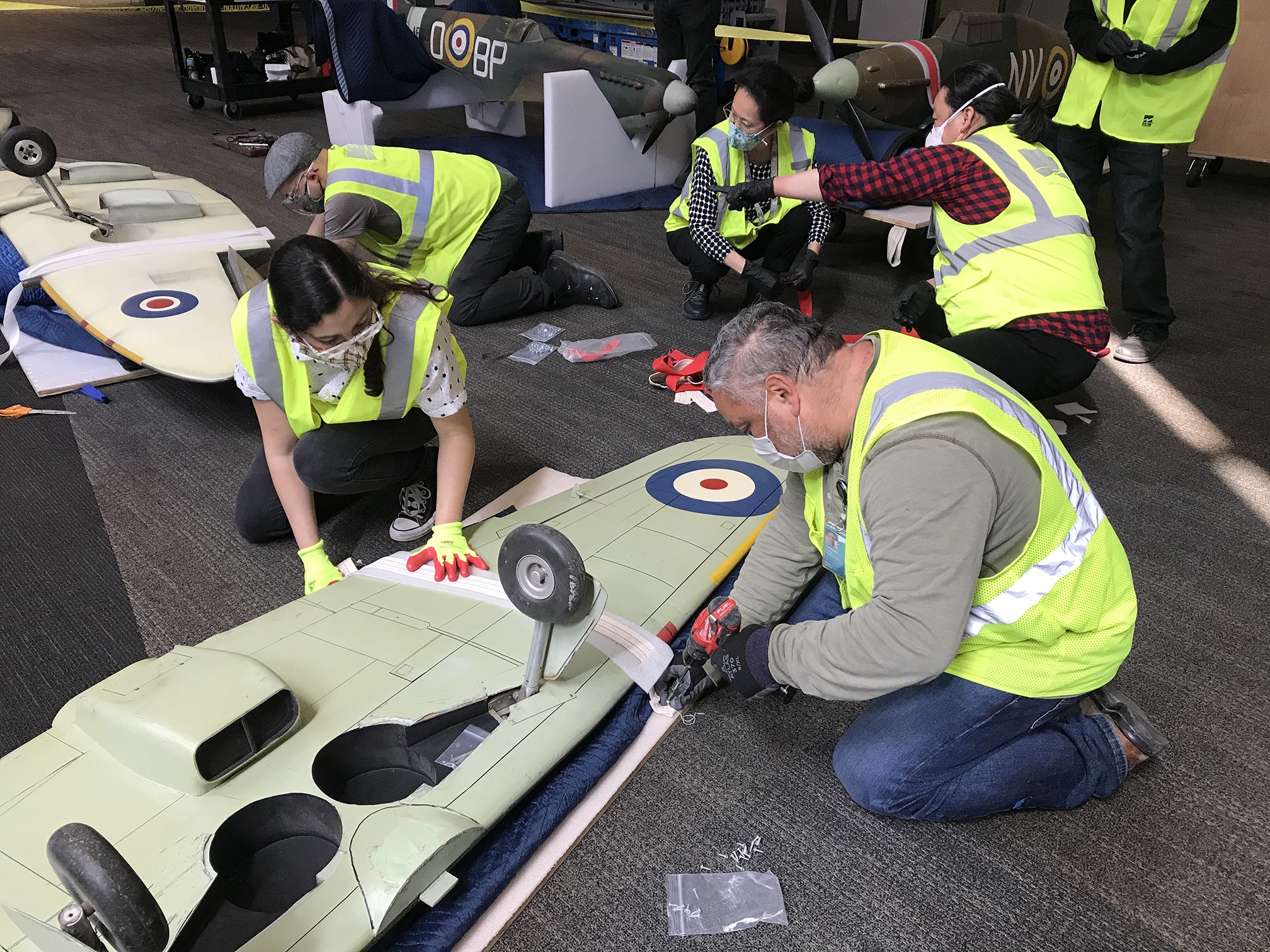 When each plane is safely on the ground, the rest of the crew gets to work, giving the planes a proper dusting and thorough vacuuming, assessing their condition for potential conservation needs, removing any remaining wires, and detaching the wings from the fuselage. Once a model is prepped, the technicians secure the plane to a custom-made gurney with foam-lined webbing straps, supporting delicate areas like the landing gear and wings with rolled moving blankets and foam blocks to avoid unnecessary stress on the model.