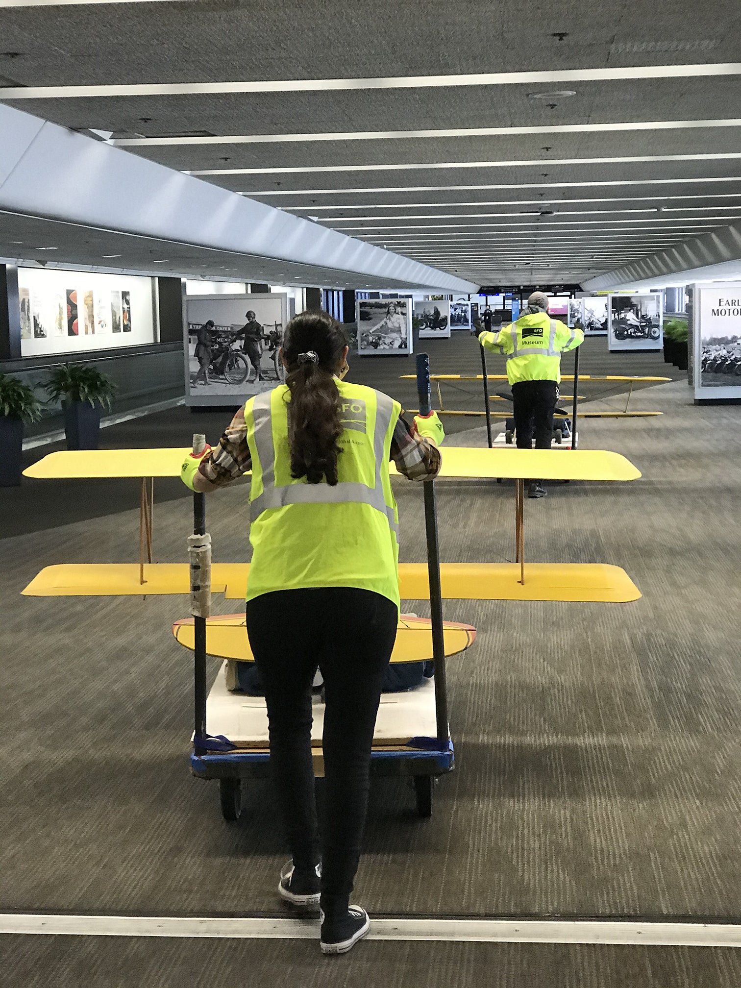 One of the many responsibilities of our Collections team at SFO Museum is to facilitate the deinstallation of exhibitions and museum objects throughout San Francisco International Airport (SFO). With a steady rotation of approximately thirty exhibitions per year on a broad range of subjects—from popular culture to commercial aviation—Museum staff regularly manage and maintain the various exhibition spaces located within SFO’s four passenger terminals.