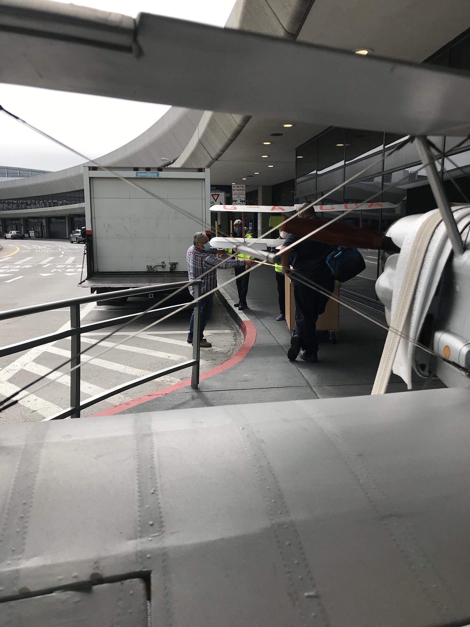 Wings get strapped to gurneys for transport through the concourse while other disassembled components are photographed and labeled for reference