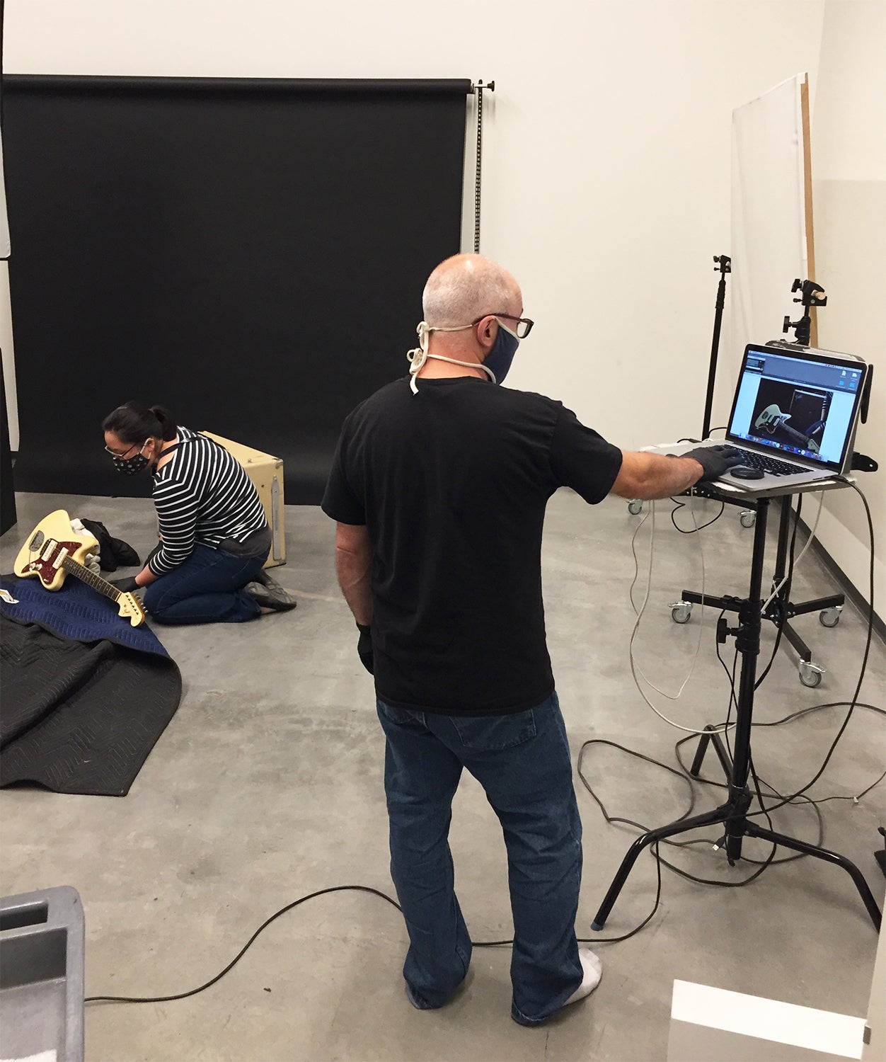 Dave Wronski’s Fender Jaguar in SFOM art storage | SFOM technician fitting a mount crafted specifically for Dave Wronski’s Fender Jaguar