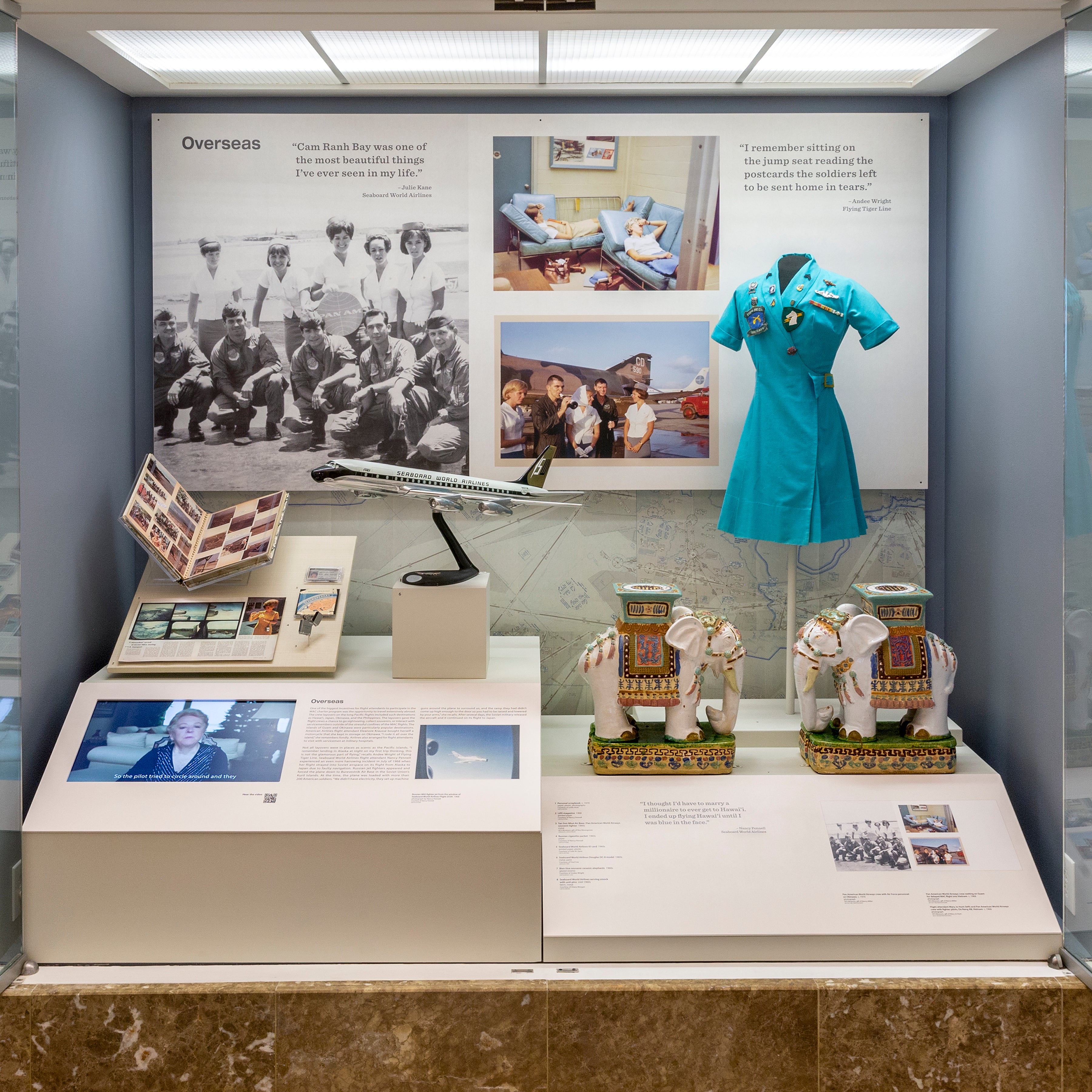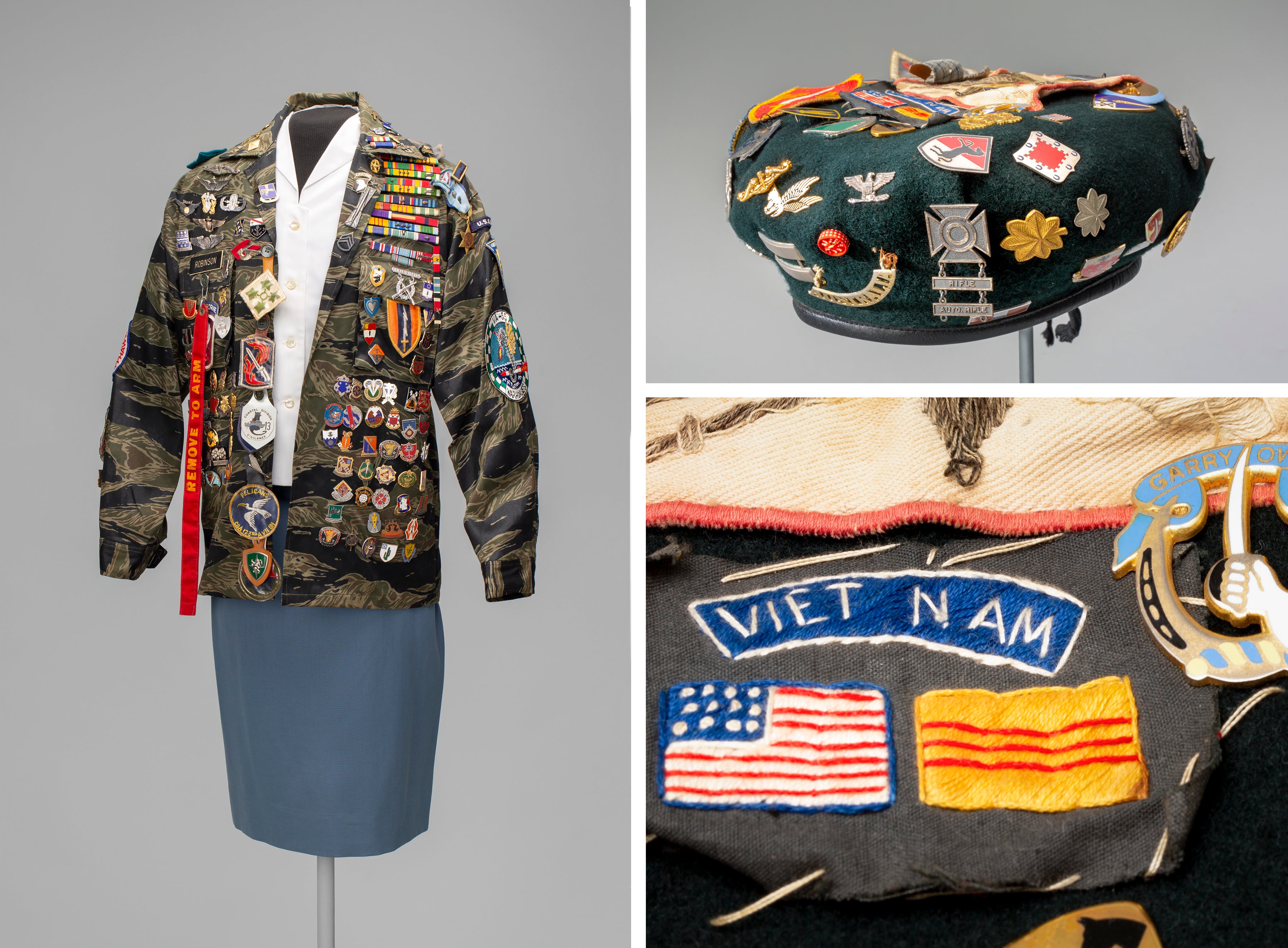 Adorned U.S. Army jacket worn over Pan American World Airways flight attendant uniform 1960s; fabric, metal; SFO Museum: jacket gift of Ann Ogle and Pamela B. Taylor; skirt and blouse gift of Eleanor Lum Young; 2007.089.001, 2011.062.003-.004; L2019.2316.005, .007, .008