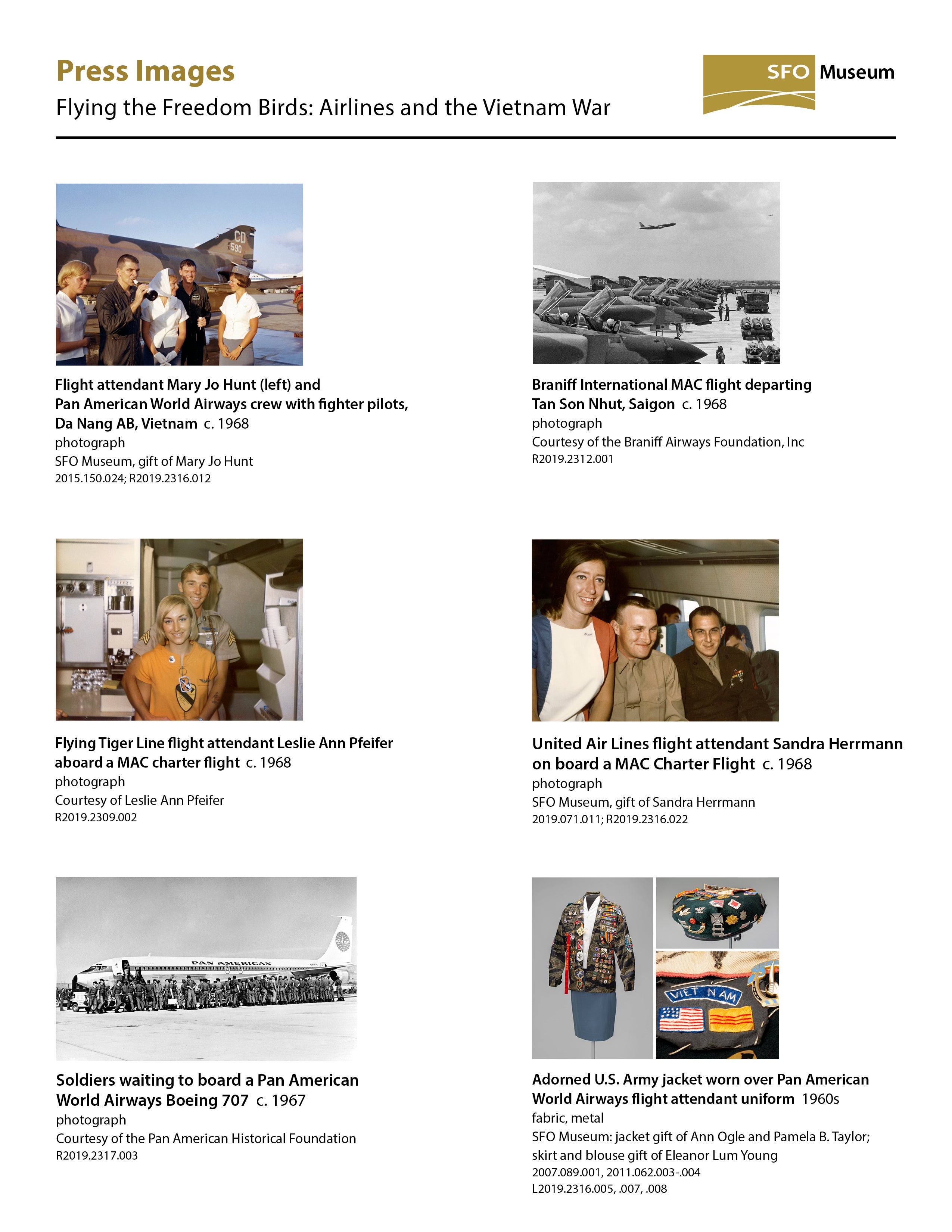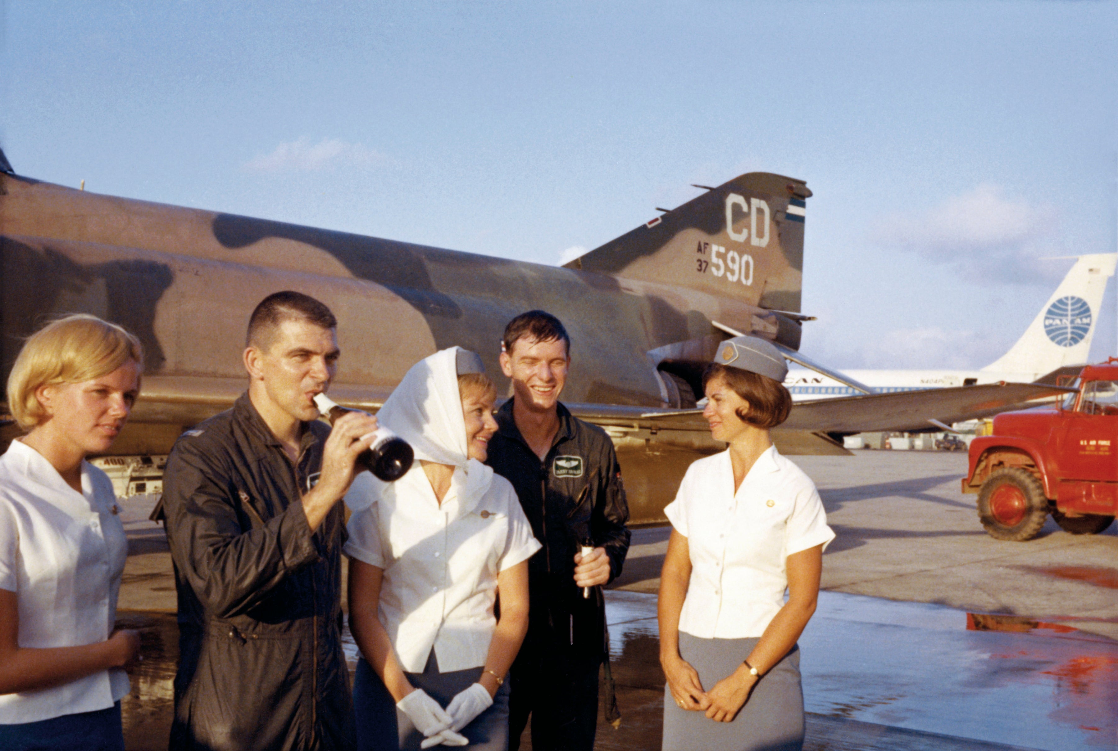 Flight attendant Mary Jo Hunt (left) and Pan American World Airways crew with fighter pilots, Da Nang AB, Vietnam c. 1968; photograph; SFO Museum, gift of Mary Jo Hunt; 2015.150.024; R2019.2316.012