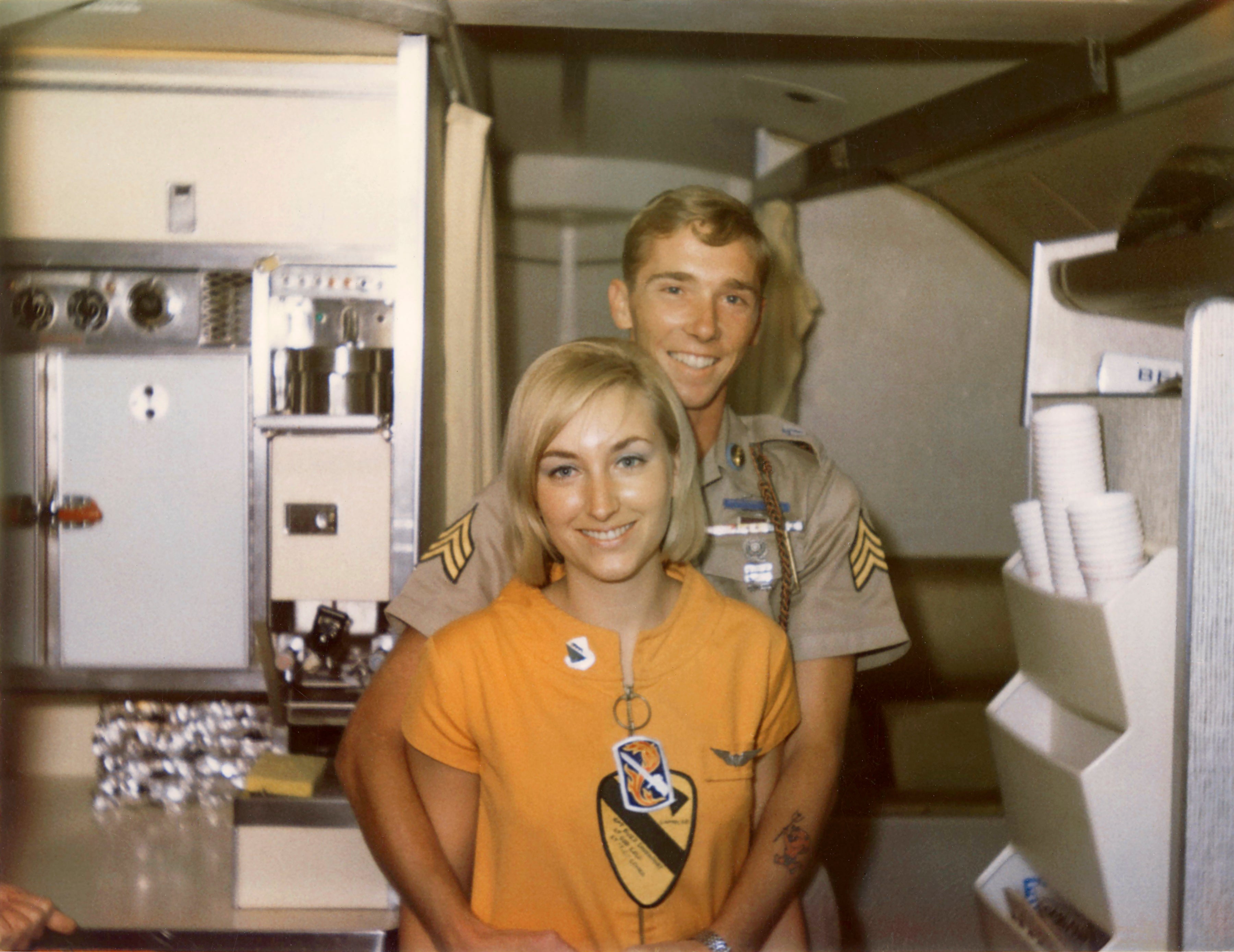 United Air Lines flight attendant Sandra Herrmann on board a MAC Charter Flight c. 1968; photograph; SFO Museum, gift of Sandra Herrmann; 2019.071.011; R2019.2316.022