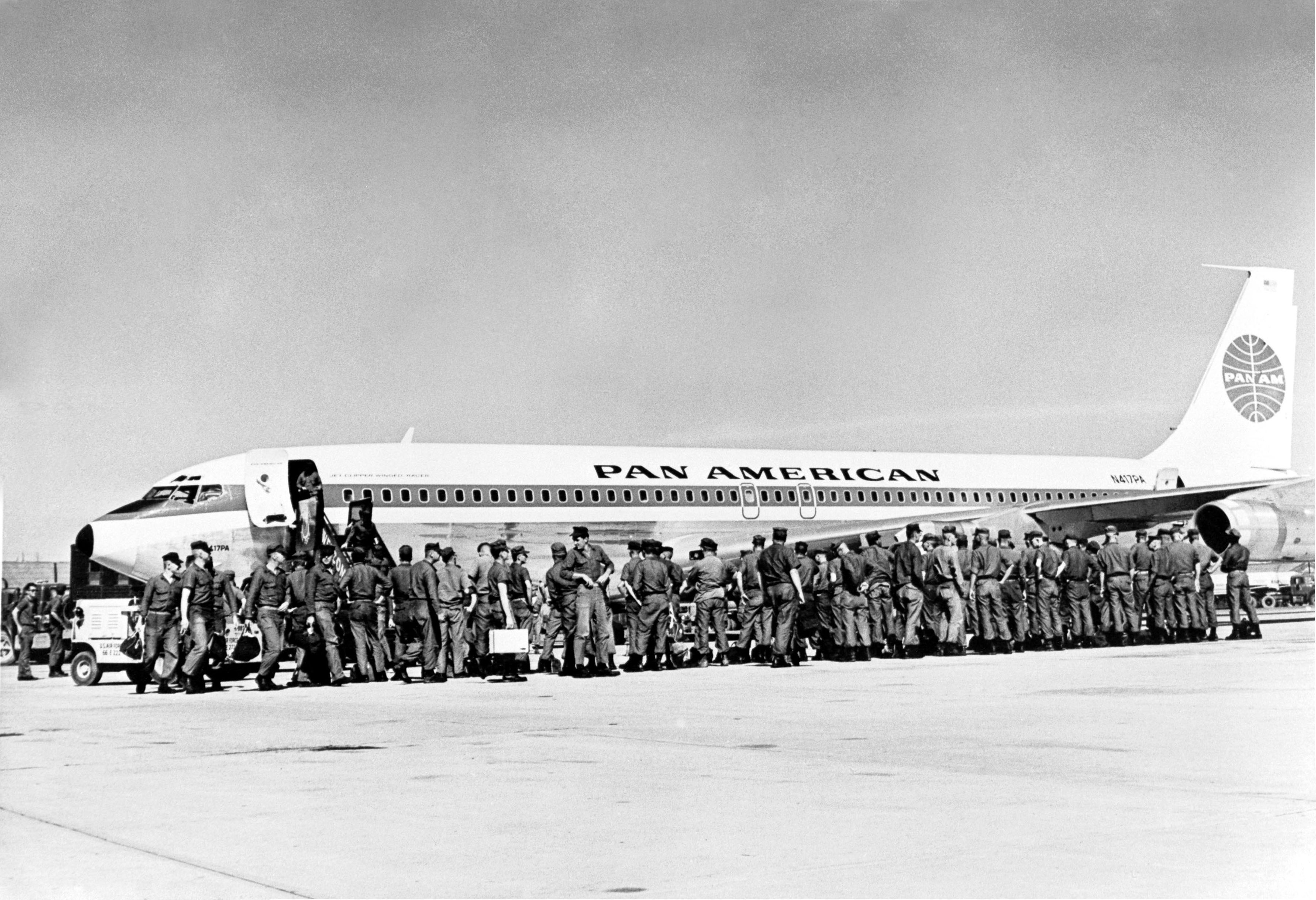 Soldiers waiting to board a Pan American World Airways Boeing 707 c. 1967; photograph; Courtesy of the Pan American Historical Foundation; R2019.2317.003
