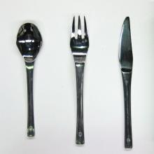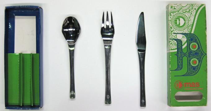 a) Green box with company logo b) fork c) spoon d) knife. Company logos on the end of the utensils.
