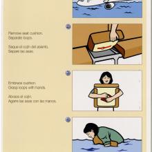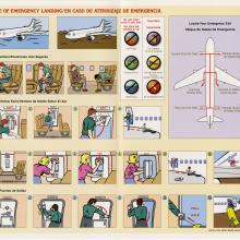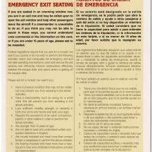 Safety information card issued by Emirates for its Boeing 777-300 fleet; blue quadrant along top edge of cover with airline wordmark; pale yellow rectangle with written instructions for passengers in the emergency exit row.