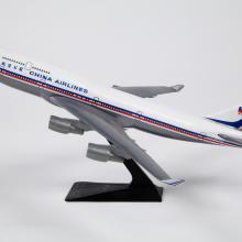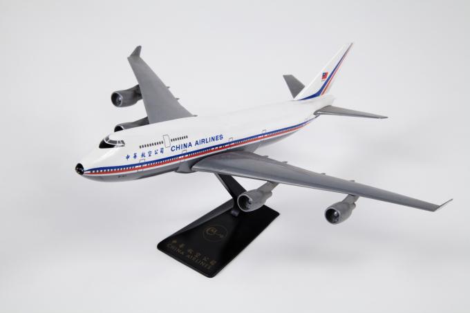 a. China Airlines, Boeing 747-400 desktop model aircraft; white fuselage with red and blue cheatline; “China Airlines” printed in two languages on both sides of fuselage; gray wings and winglets, engines, and horizontal stabilizers; blue and red diagonal stripes on vertical stabilizer with small flag emblem and aircraft registration number “B-161”; scale 1:?.