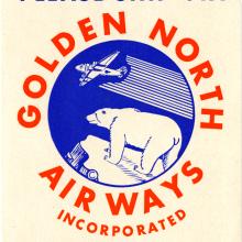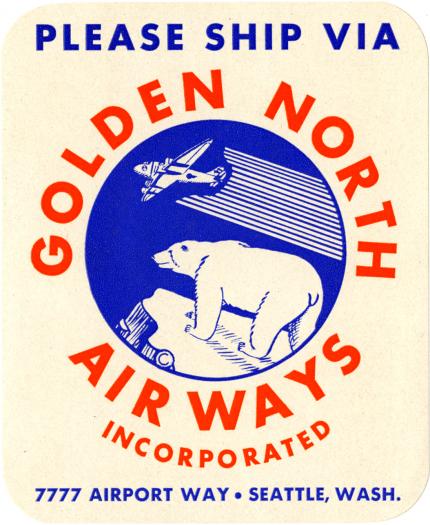 Square white, blue and orange label with "Please Ship Via Golden North Airways Incorporated, 7777 Airport Way, Seattle, Wash."; illustration of polar bear on ice floe and airplane flying overhead.