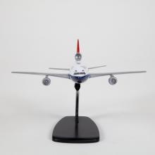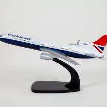 a. British Airways, Lockheed L-1011 TriStar desktop model aircraft; white and blue fuselage, silver wings, navy blue “British Airways” above windows; “AE G-BBAE” above horizontal stabilizer, navy blue “TriStar” on side of center engine; red and blue vertical stabilizer; scale 1:200.
