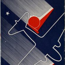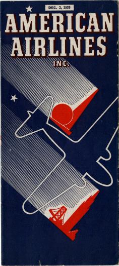 Timetable issued by American Airlines, effective December 2, 1939; dark blue, red and white cover with white planform outline of plane and images of a few world landmarks silhouetted in red; airline wordmark at top.