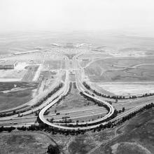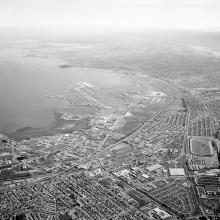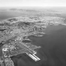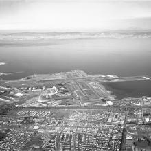 Today, SFO Museum holds approximately 750 photographic negatives made by Moxom while on assignment at the Airport. A formally trained photographer, Moxom’s images are marked by an outstanding level of craftsmanship and careful composition. They exhibit a sense of artistry not commonly seen in works by editorial photographers of the era. Presented here are aerial photographs made by Moxom between 1958 and 1964 that depict the Airport and surrounding landscape of the San Francisco Peninsula.