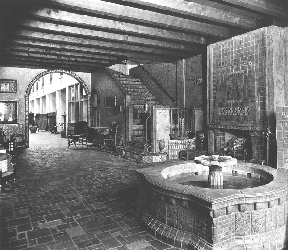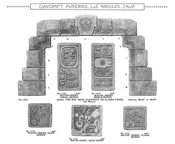 Exhibitions inside the California Building at the 1915 Panama-California Exposition in San Diego used cast concrete to reimagine the facades of massive, pre-Hispanic stone palaces and pyramids. Architect Frank Lloyd Wright (1867–1959) designed homes made from concrete blocks that re-envisioned Mayan ruins. Tilemakers created pre-Hispanic Revival-style designs that were installed in staircases and around the fireplaces of many Spanish Colonial Revival-style homes.