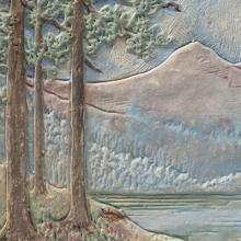 Claycraft Potteries, founded in 1921 in Los Angeles, was one of the preeminent makers of Southern California relief tiles. When making pictorial tiles for their Handmade line, workers at Claycraft hand-pressed clay into plaster molds that included incised details, such as the cross-grained “forking” evident in sections of sky and other backgrounds. After setting-up in the molds, tiles were hand-painted with colorful glazes before firing in the kiln.