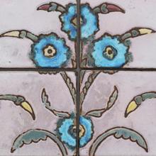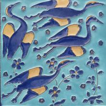 Drawing on ancient relief tilemaking techniques, Spanish ceramicists developed cuenca tiles during the fifteenth–sixteenth centuries. Cuenca tiles, also known as arista, are made by pressing soft clay into shallow molds before bisque-firing and decorating with glazes for final firing. Cuenca tiles take their name from a Spanish word for “basin” and rely on areas of low relief to keep their colorful pockets of glazes separated. California Faience, located in Berkeley, made cuenca tiles by pressing clay into plaster molds that created “little dams” to contain multicolored glazes applied with syringes. Known for their artistically rendered tiles and reputation as a studio pottery rather than a tile factory, California Faience supplied tiles designed by architect Julia Morgan (1872–1957) for Hearst Castle in San Simeon.