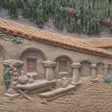 From 1925–35, Muresque Tiles, located at 1001 22nd Avenue in Oakland, California, produced some of the finest pictorial relief tiles made during the golden era of California tilemaking. Molded in high relief by hand from plaster molds, Muresque tiles portrayed idyllic West Coast scenery, fantastical images of ships at sea, and romanticized Spanish, Mexican, and European scenes. Available in more than 130 different designs, these imaginative and artful tiles were hand-painted in either a single-color slip, or in a polychrome finish with multiple colors of liquid-clay glazes. Muresque pictorial tiles were often installed around fireplaces within interlocking architectural moldings and sections of plain-finished tiles. Muresque closed its Oakland factory in 1935 under financial strain from the Great Depression.