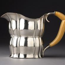 The turn of the twentieth century was a period of great artistic ferment throughout Europe. Increasing numbers of designers rejected the historicism of their national arts and asserted new styles. Many formed collectives to produce beautiful household objects for wider distribution. Josef Maria Olbrich's pewter decanter was one of the architect's designs for non-silver items produced at the Darmstadt Artists Colony in Germany. Among Josef Hoffmann's designs for his Wiener Werkstätte (Vienna Workshop) was a small, fluted cream pitcher tastefully decorated with tiny beading and ivory handle.