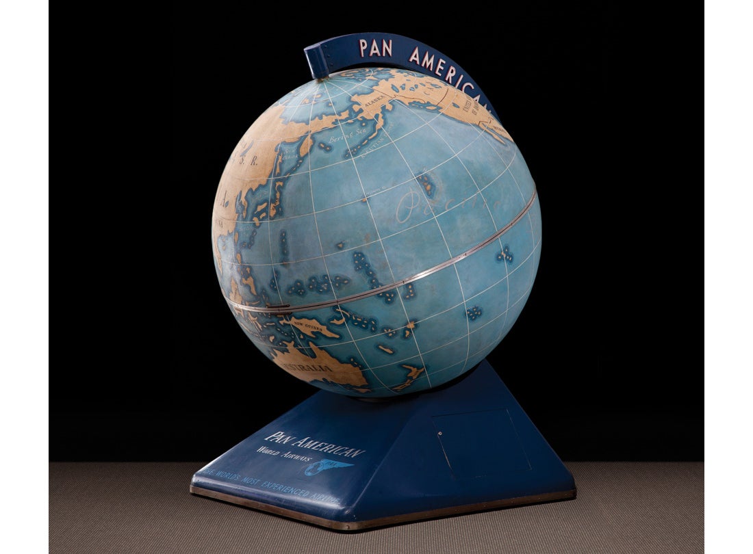 Pan American World Airways floor globe 1939 (modified 1940s) polychrome cork, aluminum, wood, mechanical works