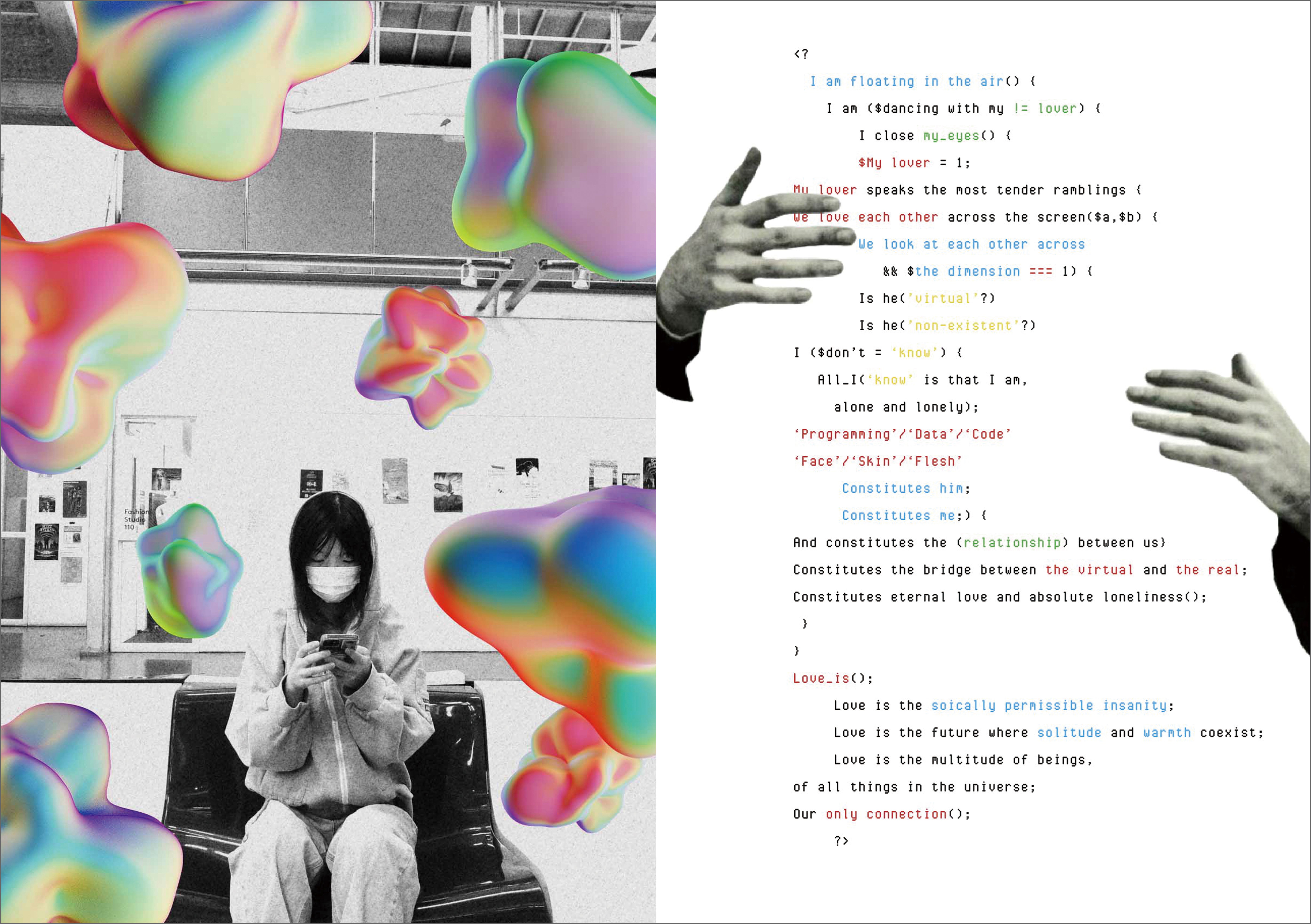 California College of the Arts’ (CCA) design program includes the course Machinic Modernity, which is taught by Erik Adigard and Ignacio Valero. The class intersects contemporary design practices with a global understanding of “progress” framed by Western interpretations of modernity and technology. Master of Fine Arts (MFA) design student Celia Ziyan Cai’s project for Machinic Modernity, Constitution, reflects identity in today’s digital-oriented society. With herself as the subject, the artist uses a rich mix of images, graphics, and typography to explore how the relationships between organic beings and artificial beings are constructed, deconstructed, and reconstructed in digital environments. The designs are presented as a dramaturgy structured in four parts: Identity, Community, Environment, and Catharsis.