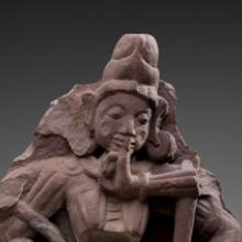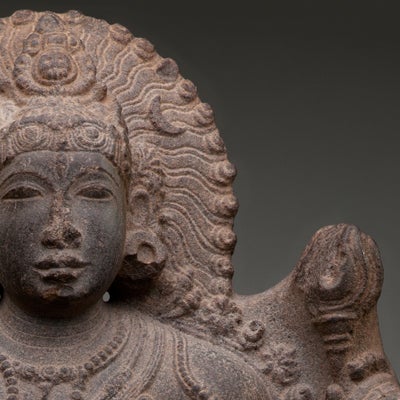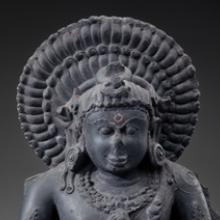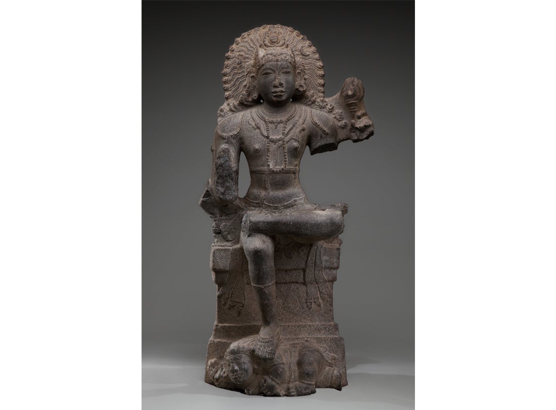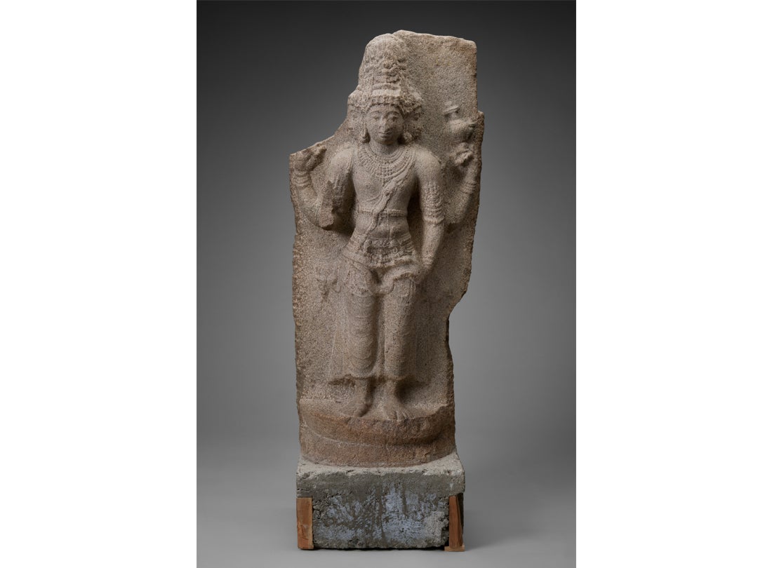 Shiva is recognizable by the vertical third eye in his forehead and the small snake, skull, and crescent moon in his elaborate hair locks. Not all depictions of Shiva have all of these characteristics. Here Shiva sits teaching an unseen group of sages, with one of his feet resting on a dwarf, representing ignorance. In this form, Shiva imparts the divine knowledge that leads from bondage to freedom in this world. The Sanskrit term by which this form of Shiva is known has as a secondary meaning “south–facing.” In the region from which this sculpture comes, such sculptures were often placed in a niche in the south walls of temples.