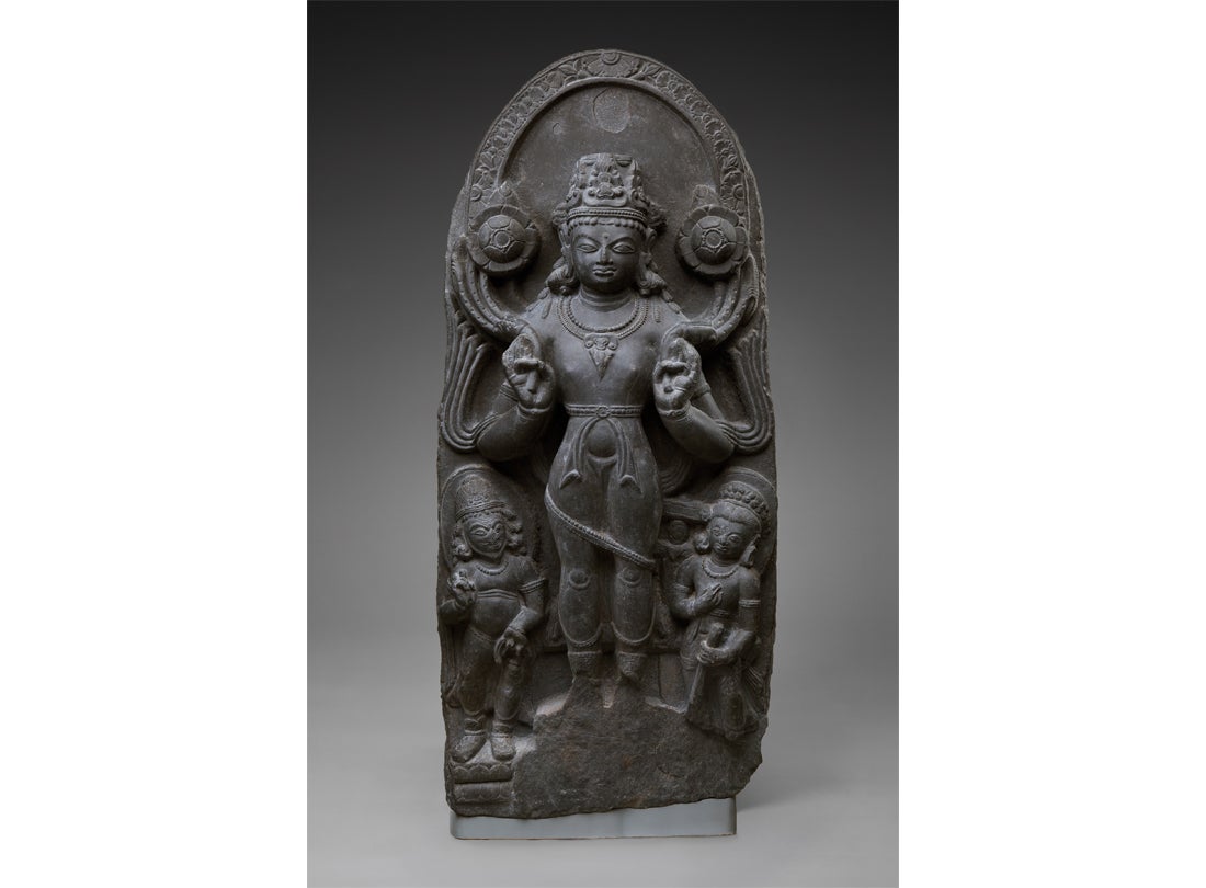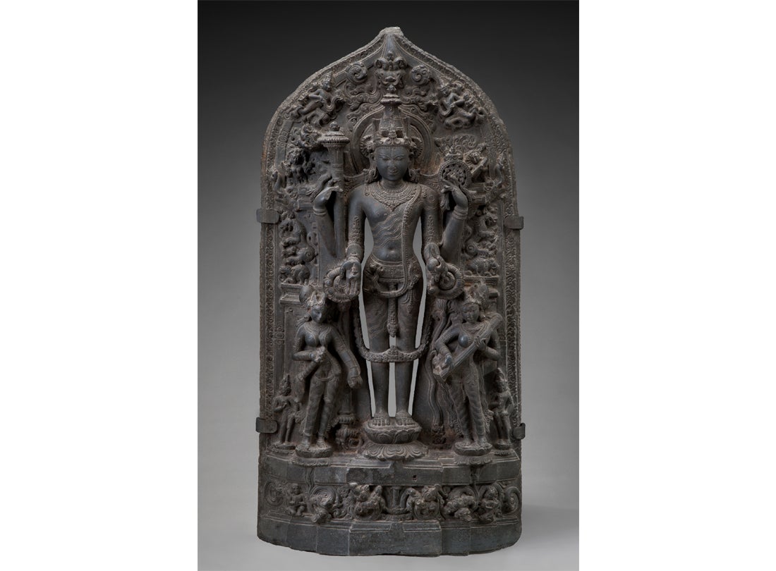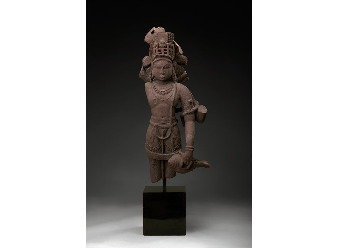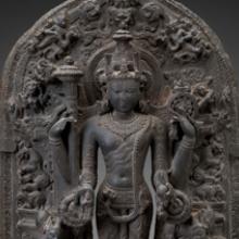 Vishnu is one of the most important Hindu deities. He is associated with the maintenance of rightful order in the world. When negative forces threaten this order, he descends to earth in one form or another to overcome the negative force. The forms he takes include fantastic creatures, such as a man-lion, as well as human forms, such as the hero deities Rama and Krishna. Vishnu is shown with four arms symbolizing his superhuman power. He holds implements usually associated with him: a club, war discus, and a conch shell.