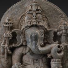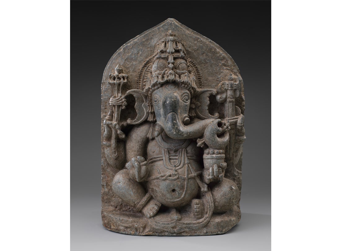 Ganesha is a remover of obstacles, and the worshiper who honors him before any undertaking—including the worship of other gods—is ensured success. Crowned and bejeweled, as befitting his status as one of India's most beloved gods, Ganesha is represented grasping objects frequently associated with him: a battle axe, a lotus, a bowl of favorite sweets, and the broken tusk Ganesha sacrificed to pen the great hindu epic The Mahabharata. Ganesha’s trunk bears evidence of multiple rubbings by devotees to ensure good fortune.