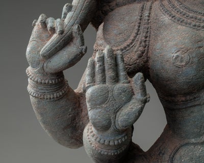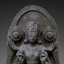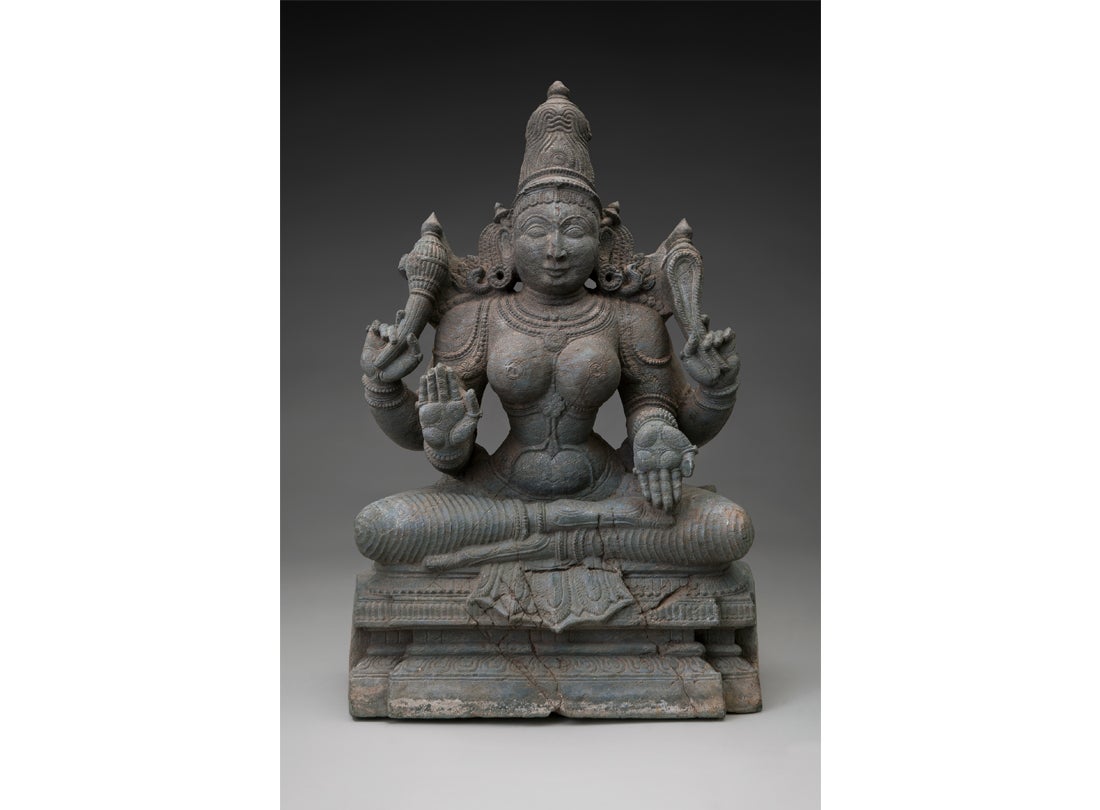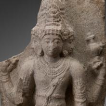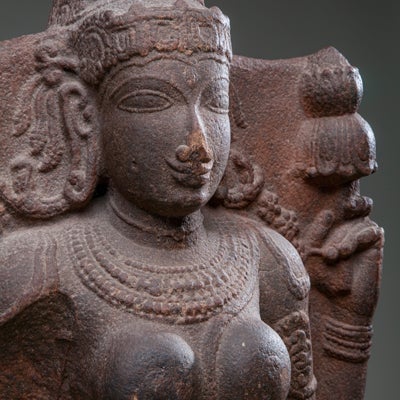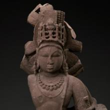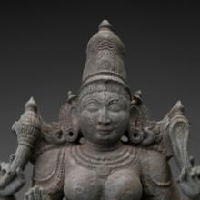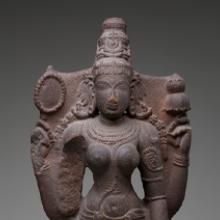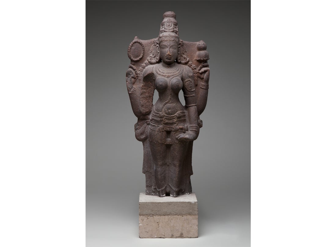 The beautiful Parvati is the wife of the great god Shiva, and mother of the elephant–headed Ganesha and the war–god Skanda. She is one aspect—a benevolent one—of the Great Goddess, whose fierce aspects are known as Durga and Kali. Here Parvati, four-armed, stands in a formal position and holds two items frequently associated with her, a lotus for beauty and transcendence, and a rosary for piety. Parvati is shown with the large eyes, round breasts, narrow waist, and broad hips that were elements of ideal beauty for a woman in ancient India.
