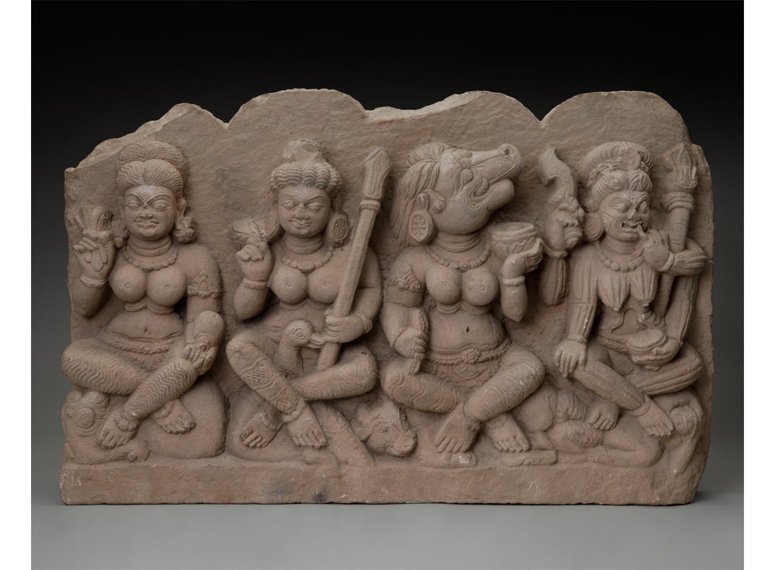 This panel, before it was broken, would have included seven Hindu goddesses known as “mothers.” These goddesses embody the energies of male gods to whom they are linked by their names. The goddesses also hold symbolic implements and sit on the animals associated with these male gods. From left to right: Indrani, representing the energy of the god Indra, holds a thunderbolt and sits on an elephant; Kumari, the female counterpart of Skanda (also known as Kumara), holds a spear and sits on a peacock; Varahi, associated with Vishnu in the form of the boar–headed Varaha, holds a skull–cup and sits on a buffalo; and Chamunda (who does not have a male counterpart) holds a skull–cap and a trident and sits on a corpse. Missing are the other three Mother Goddesses: Brahmani, counterpart to Brahma; Maheshvari, associated with Shiva; and Vaishnavi, Vishnu’s female counterpart.