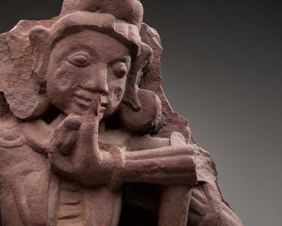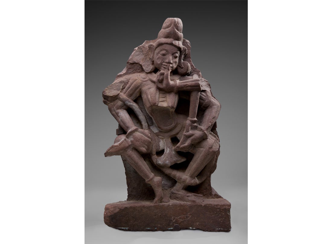 The two foremost male gods of Hinduism, Vishnu (Hari) and Shiva (Hara) are sometimes shown combined. Usually the combined representations, like this one, are divided in half vertically, with Shiva on the image's right. Here, one side of the figure bears half of Shiva’s vertical third eye on the forehead, and the missing arm may have held Shiva's trident. On the other side of the figure, one hand holds the conch shell associated with Vishnu.