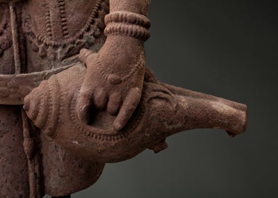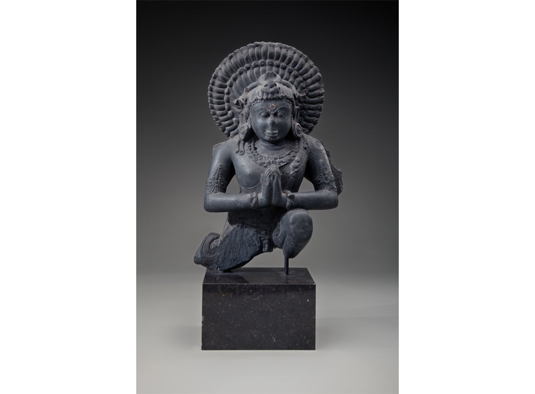 Garuda is a mythical creature with the body of a man and the wings, beak, and talons of a bird. Garuda is associated with the sun's rays and is known for his power to destroy serpents, including the two giant snakes guarding the storm god Indra's amrita, the divine nectar that confers immortality. Garuda is typically depicted adorned with eight snakes and with hands folded in supplication. Garuda’s image carved on pillars located at the front of early temples indicate his connection with Vishnu, for whom he serves as a vehicle in ancient religious texts.