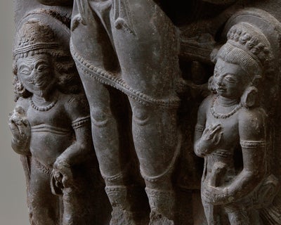 The deity Surya is associated with the skies, and particularly with the sun. Here he holds the stems of two large lotus flowers that radiate brightness. His sashes flutter at his sides as if blown by the wind. Standing to one side of Surya is his bearded scribe, Pingala, who carries a pen and inkpot. On the other side is an attendant holding a staff. His name, Danda, means “staff.” Scholars link the origins of the deity Surya with the far western parts of the Indian world near Iran, where solar deities were prominent. Even images made in other parts of India, such as this, wear the long robes and boots linked with traditional Iranian dress. Here, the robe clings to the contours of the body, but its hem can be seen along the lower legs.