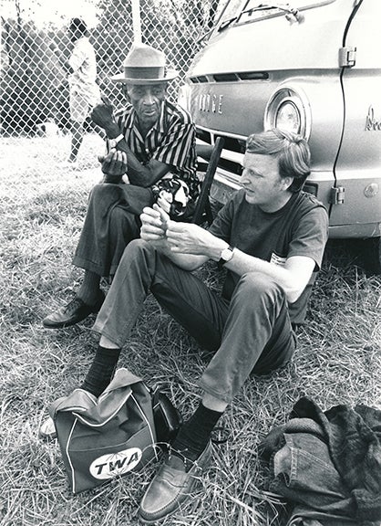 After college and a two-year stint in the United States Army, Strachwitz worked as a German teacher at Los Gatos and Saratoga high schools in California. In the summer of 1959, he traveled by bus to Houston, Texas, where he met and saw blues legend Lightnin’ Hopkins perform in a small beer joint. Struck by his improvised lyrics and spontaneous exchange with the audience, he knew he wanted to record him in that setting. Strachwitz returned the following year hoping to capture Hopkins live—only to discover that the musician was on his way to California. Strachwitz’s friend and host Mack McCormick, an amateur folklorist, musicologist, and taxi driver, then took him north to the rural town of Navasota, where the pair met and recorded Mance Lipscomb, a Texas sharecropper skilled at performing a variety of folk songs, ballads, dance tunes, and blues.