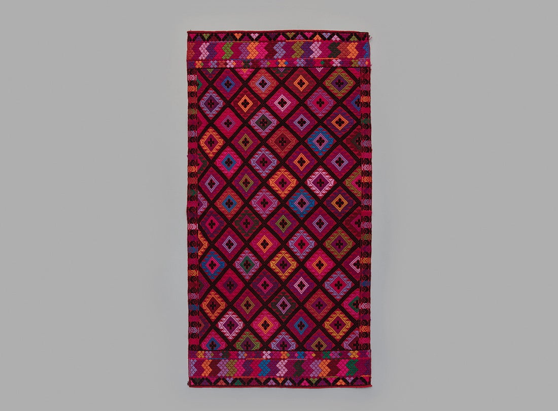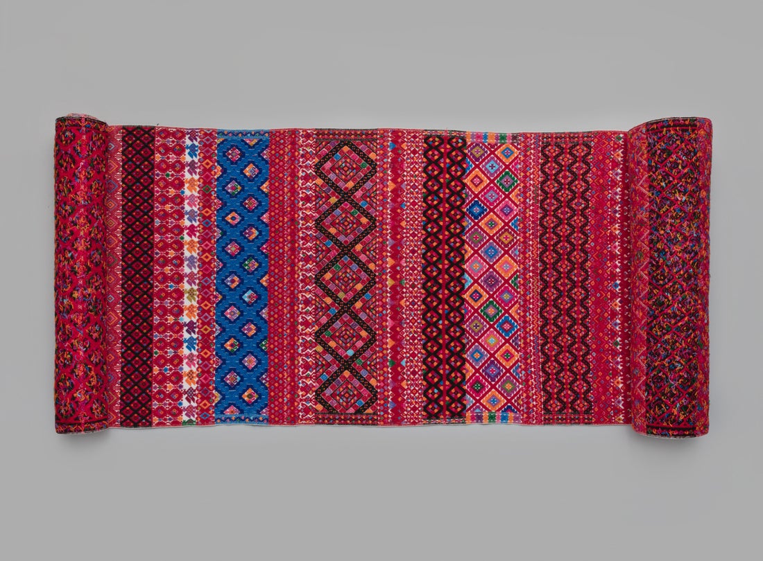 Weavers keep sample textiles known as muestras as a reference to symbols and designs. Muestras vary in size and shape and may be passed down through generations. More extensive muestrario textiles are sometimes woven to document an entire range of design. Magdalena López López, a master artisan from the village of Bayalemó in San Andrés Larráinzar, has woven a series of long and exquisite muestrario textiles. The first was completed in 2000 with her sister, María López López, following inspirational dreams by both women. Titled Sueño del Manto de la Virgen, it contained many of the traditional symbols and new designs Magdalena and María López were capable of creating. The muestrario on display in this exhibit was woven and embroidered as an updated, visual catalog by Magdalena López López from 2014–16. This larger tapestry contains more than 134 bands of pattern, from newly envisioned symbols to contemporary designs and ancient Mayan symbols from antiquity.