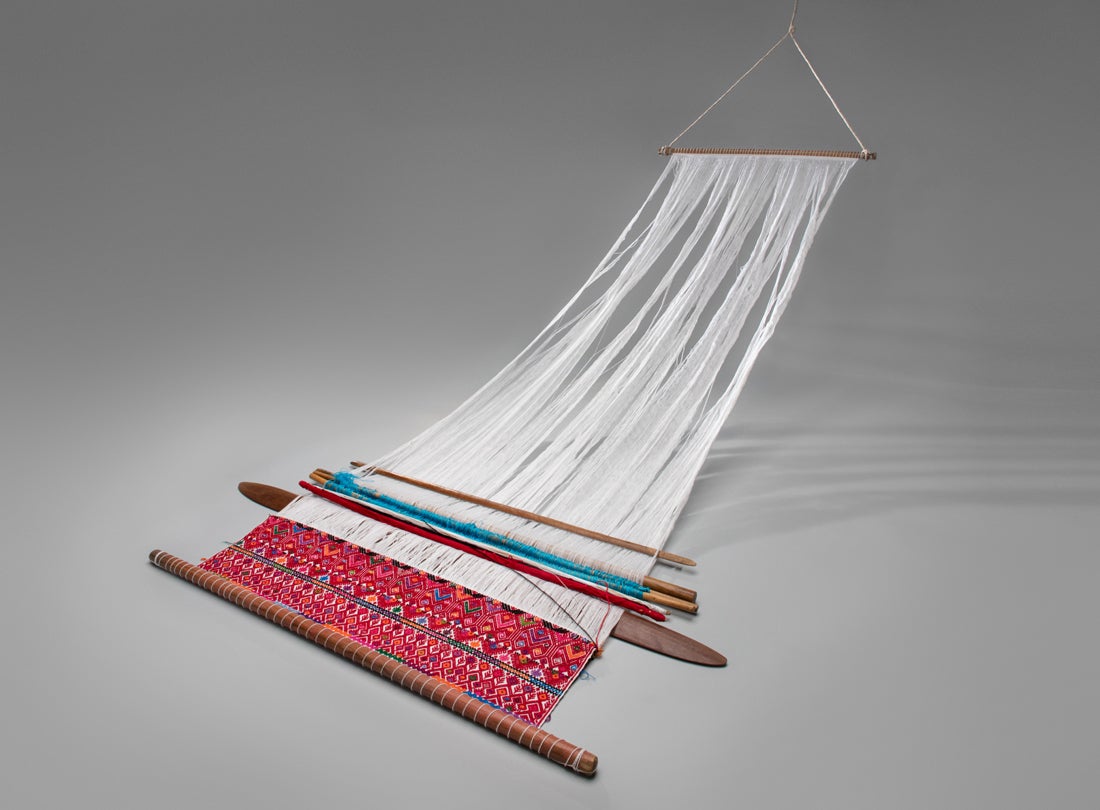 Women from Chiapas have woven on backstrap looms for centuries. The backstrap loom is a simple device capable of producing exquisite textiles in the hands of a skilled weaver. These portable looms are easily installed in the home, either outside or indoors, allowing the weaver to tend to other duties and relocate when needed. With one end anchored to a tree or post and the other connected by a backstrap around the weaver’s waist, long warp threads are suspended between two wooden end-posts and a series of rods. Weft thread is woven horizontally between the long warp threads, with alternating, multicolored thread added when weaving designs in brocade. Leaning forward or backward controls tension of the loom, and a wooden sword sets each line of weaving.