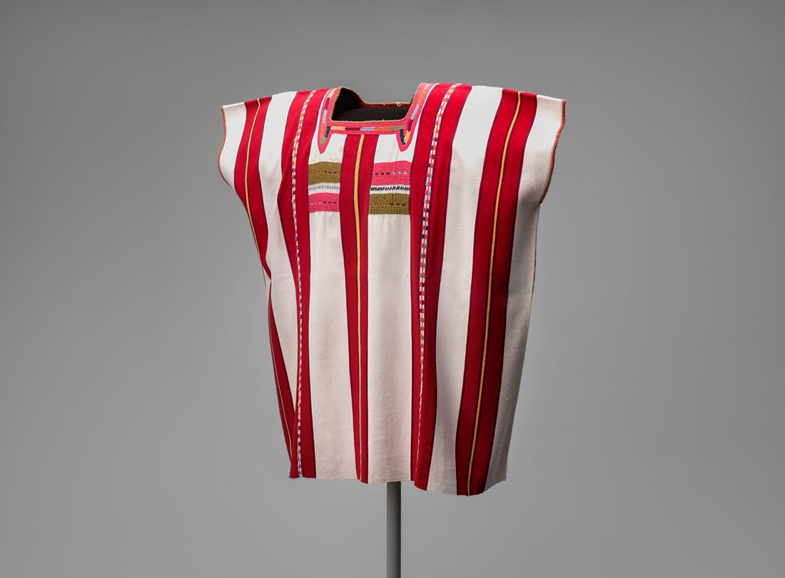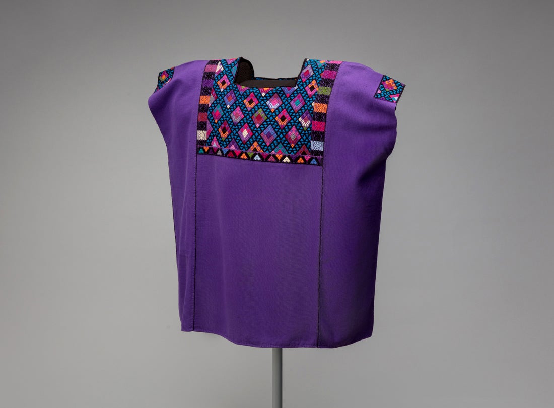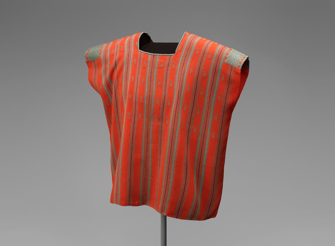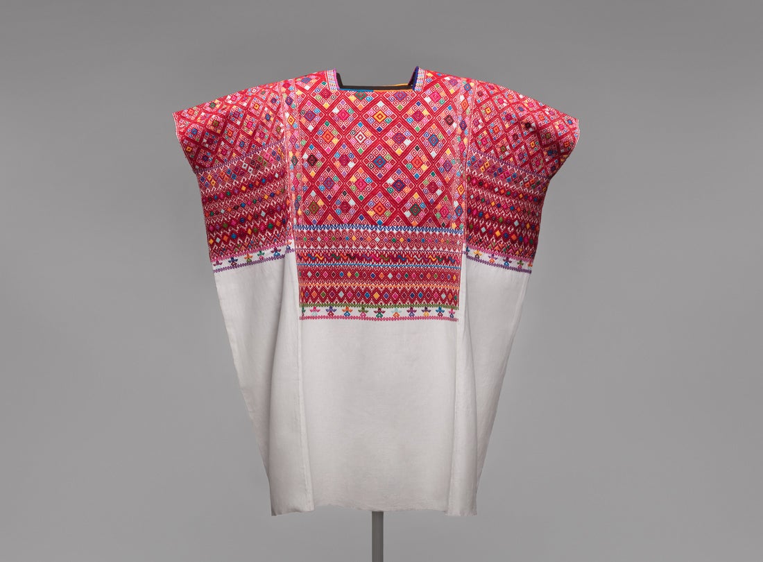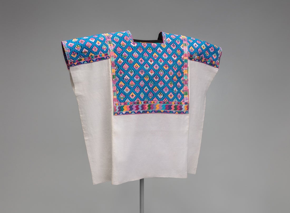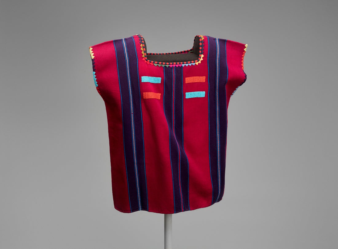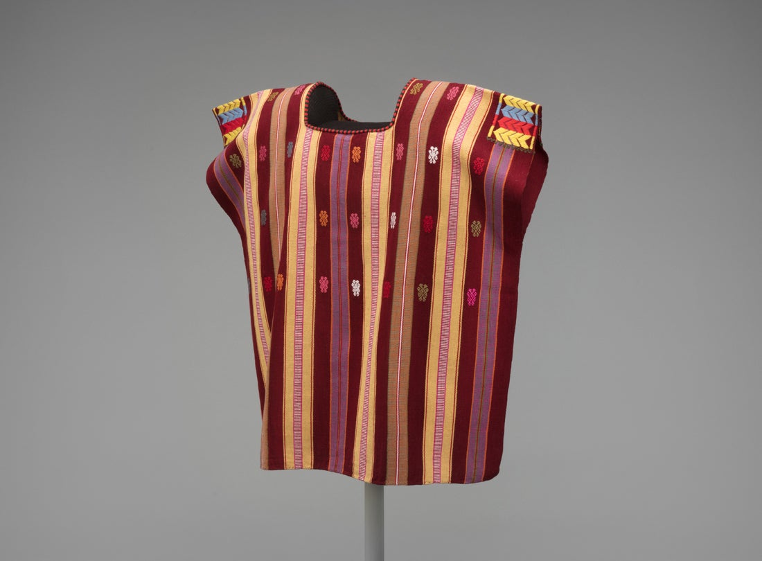 Traditional Mayan women’s attire worn throughout Los Altos de Chiapas includes a decorated, flat-sewn blouse and a long skirt cinched with a sash, often made by the wearer or another local weaver. Styles of dress and decoration vary by community and identify the unique and culturally distinct populations of Los Altos. In the eastern highlands, Tzeltal-speaking women of Oxchuc wear handwoven blouses with wide, alternating stripes, and embroidered ray designs around the neck. Tzotzil women in northern Pantelhó are identified by blouses of narrow, intricately woven stripes accentuated with columns of embroidered or woven symbols. To the west, San Andrés women wear blouses with extensive decoration at the neck and sleeves. Their traditional huipiles feature designs in brocade and embroidery on a white, woven background, while the more recent blusa Maya style exhibits bold, bright colors made possible by modern thread.