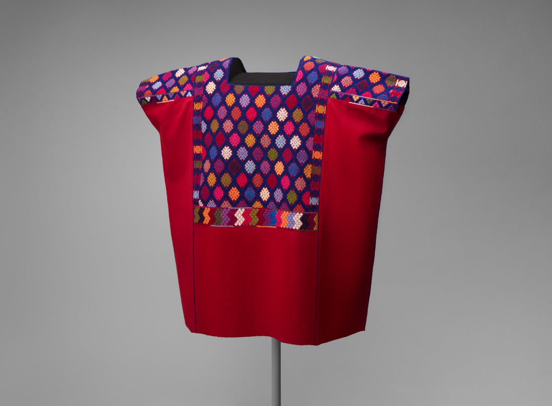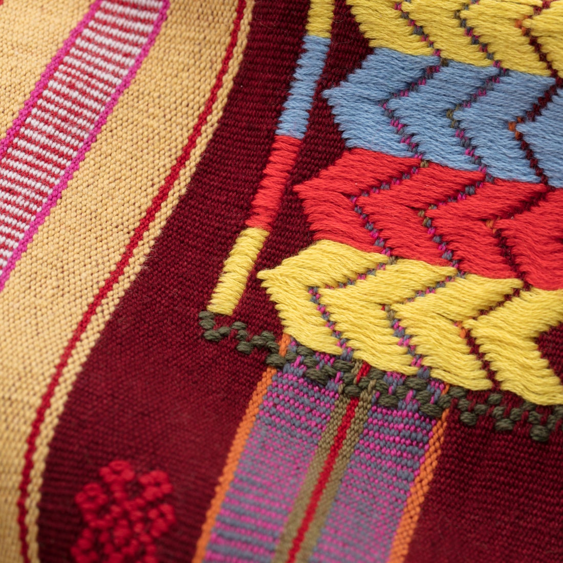 Ceremonial huipiles are among the most elaborate Mayan textiles. The finest garments are woven for the saints of fiestas and include extensive brocade and embroidery. Ceremonial textile weaving often fulfills sociocultural roles performed outside of the household known as cargos. These important roles include positions as shamans, midwives, leaders of cooperatives or fiestas, and weavers of sacred garments. Ceremonial weaving is a major undertaking, requiring months of dedicated work and financial resources that are rarely available. In addition to the thread and materials needed, expenses are incurred on the journey from the weaver’s village to the church if there is a formal procession. Religious festivities are financed by the weaver’s family, with food, beverage, incense, and fireworks purchased as necessary to properly offer a saint their new garment. Ceremonial textiles are also made to wear on special occasions, represented by this ceremonial huipil from the town of Magdalenas in Aldama, north of San Andrés.