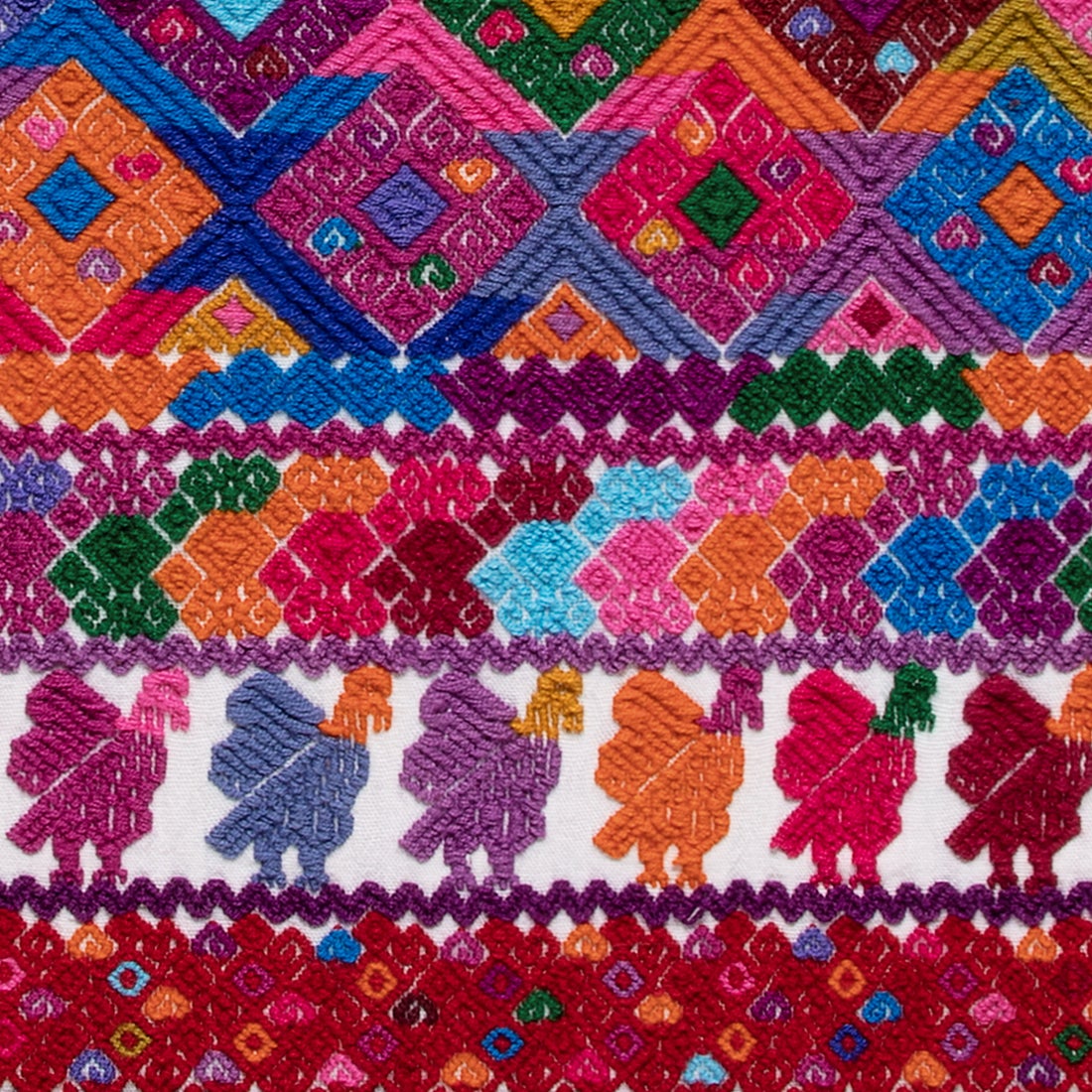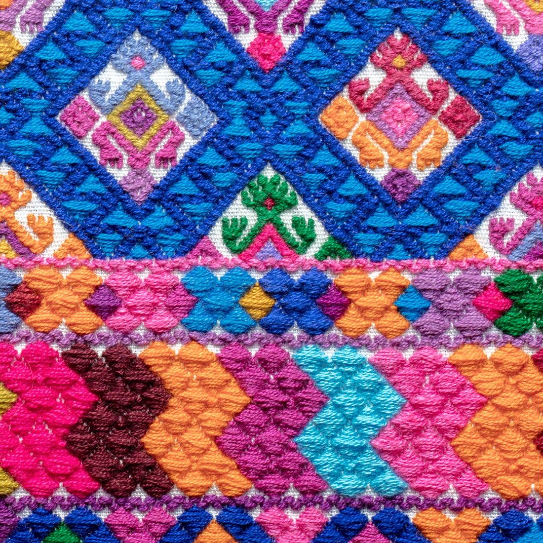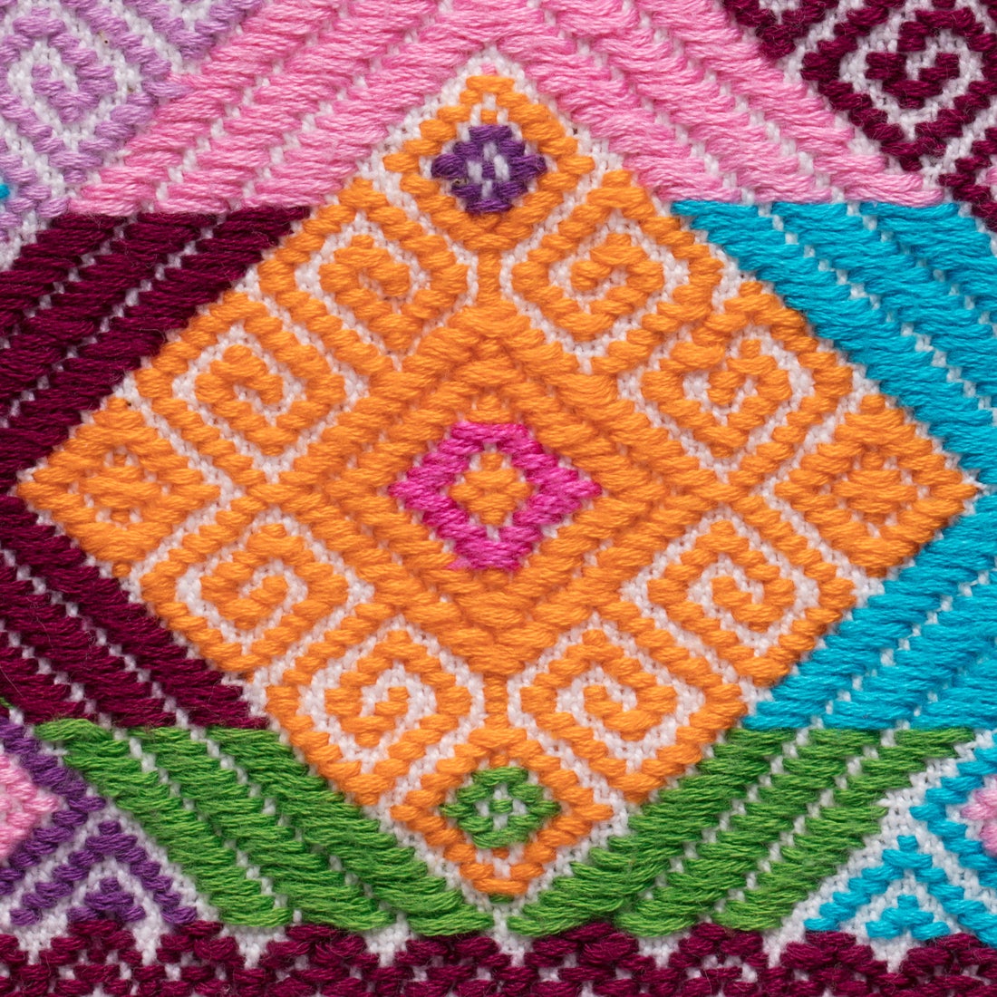 The universe is central to Mayan mythology and often appears symbolically in traditional weaving. Illustrated by a diamond motif sometimes referred to as the “Grand Design,” its four sides represent the boundaries of space and time. Smaller diamonds at the points of the symbol mark cardinal directions, with curl motifs that extend from the central diamond to recreate movement of the sun across the sky. Implemented in rows, the universe design shows the continuation of time through its repetition. The toad, or sapo, is another important and commonly interpreted symbol in Mayan weaving. Its design has roots in the ancient architecture of Bonampak, where it decorates the huipiles of queen K'ab'al Xook. The sapo symbolizes fertility and life in Mayan culture and comes to life at the start of each rainy season, when fields planted with new crops are filled with toads mating and singing in the rain, calling for another successful harvest.