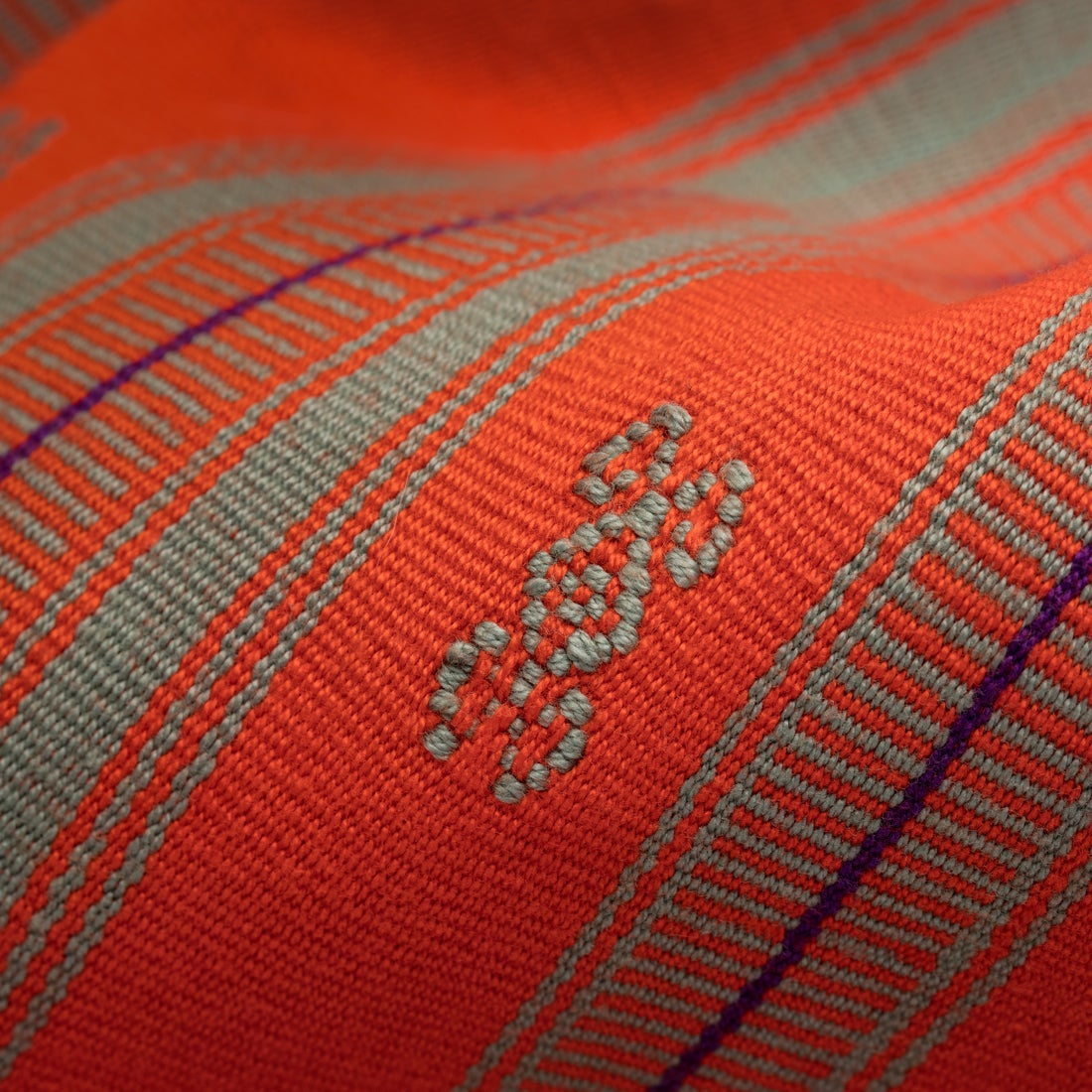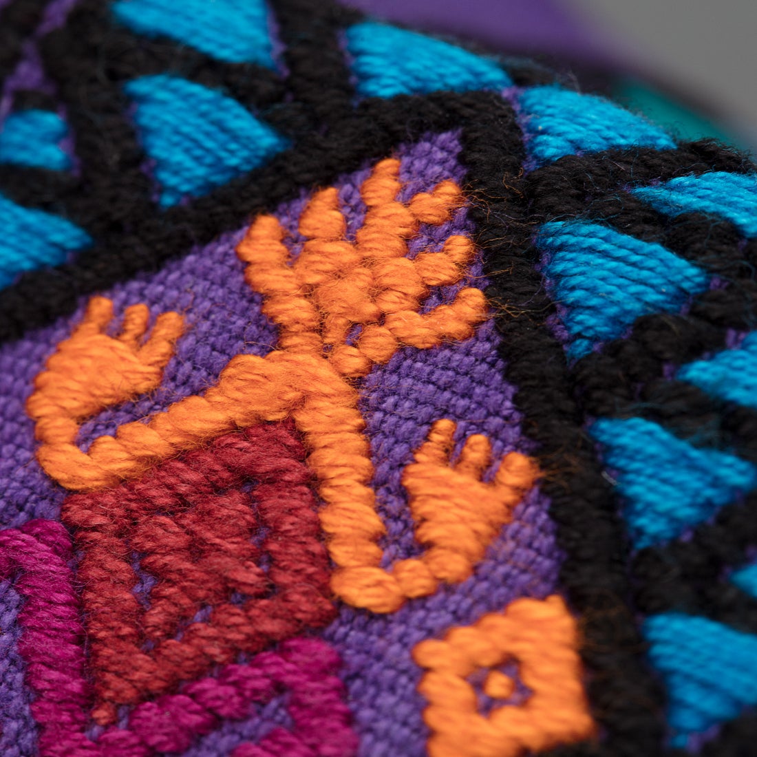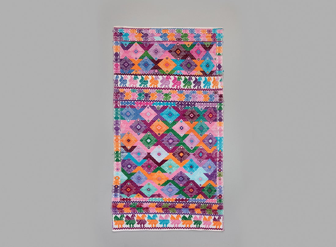 The universe is central to Mayan mythology and often appears symbolically in traditional weaving. Illustrated by a diamond motif sometimes referred to as the “Grand Design,” its four sides represent the boundaries of space and time. Smaller diamonds at the points of the symbol mark cardinal directions, with curl motifs that extend from the central diamond to recreate movement of the sun across the sky. Implemented in rows, the universe design shows the continuation of time through its repetition. The toad, or sapo, is another important and commonly interpreted symbol in Mayan weaving. Its design has roots in the ancient architecture of Bonampak, where it decorates the huipiles of queen K'ab'al Xook. The sapo symbolizes fertility and life in Mayan culture and comes to life at the start of each rainy season, when fields planted with new crops are filled with toads mating and singing in the rain, calling for another successful harvest.