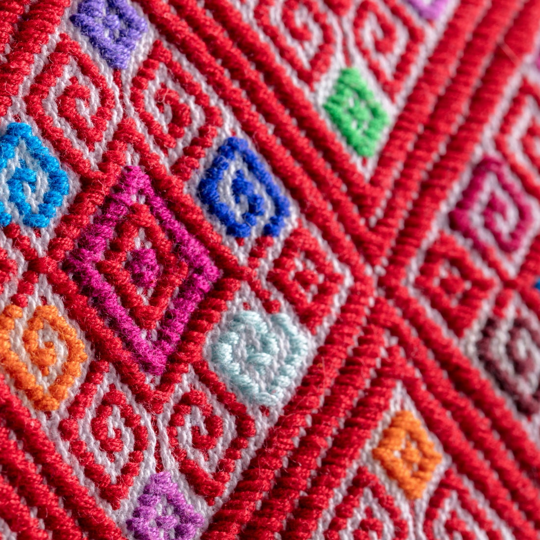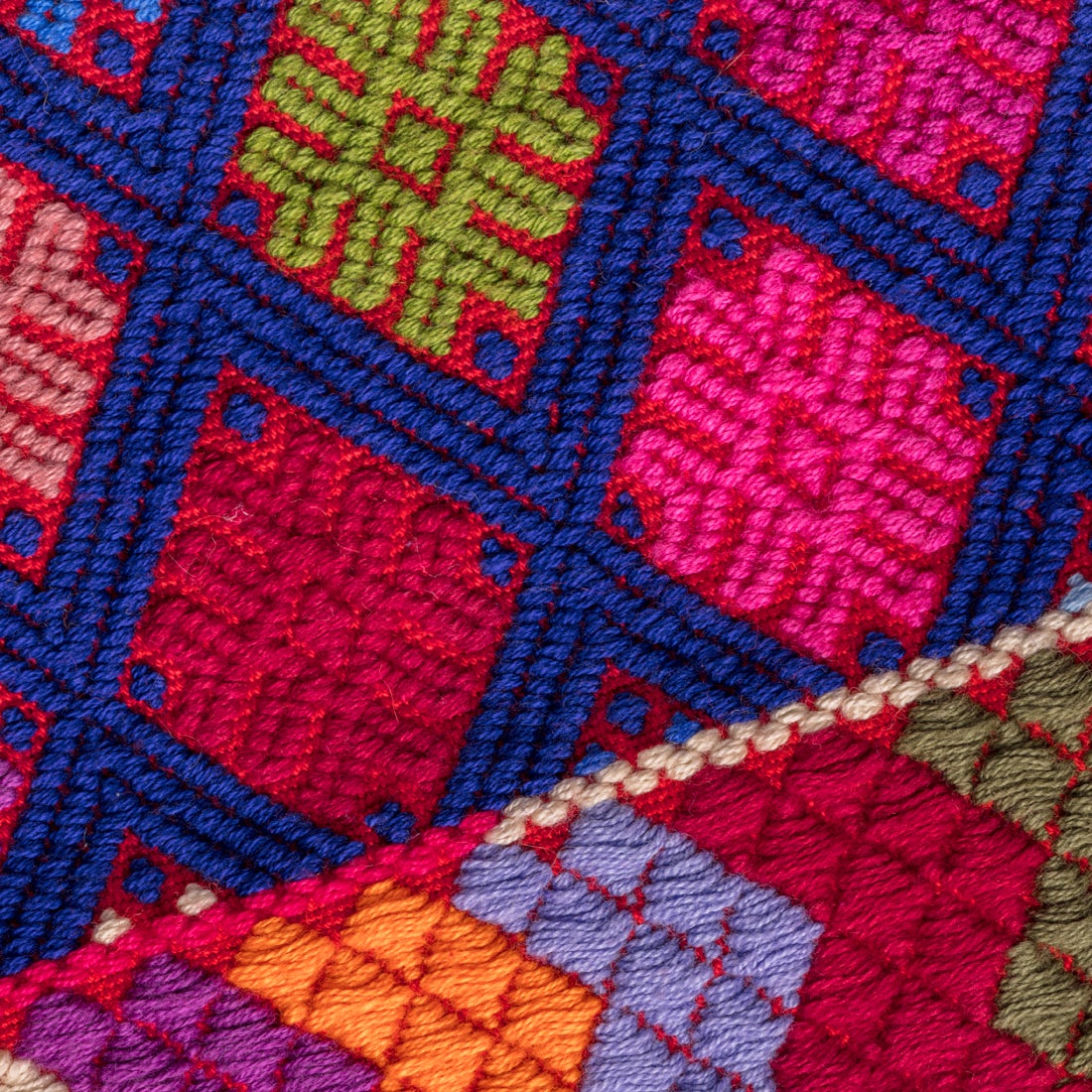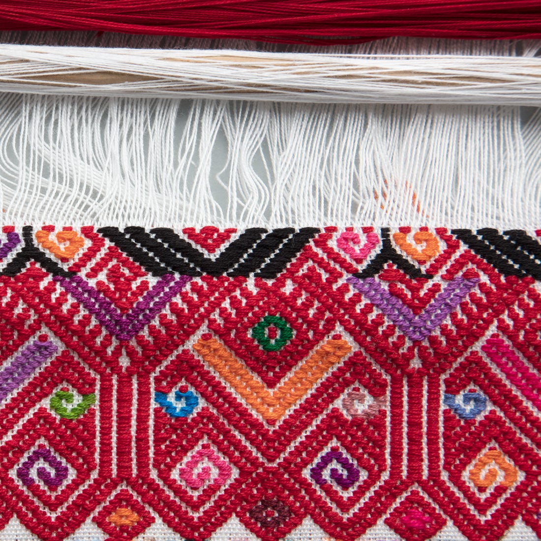 Located north of San Cristóbal de Las Casas in Los Altos de Chiapas, San Andrés Larráinzar is home to a vibrant community of weavers. For centuries, Tzotzil-speaking women in San Andrés have woven huipiles on backstrap looms in a similar manner to their ancestors of the Classic Maya Period (300–900CE). The art of Mayan backstrap weaving and its associated symbols and designs are traditionally passed down through generations of women in Chiapas. This transfer of knowledge does not always occur from mother to daughter. Some artisans, including Magdalena López López, learned their craft from grandmothers and other women in their community. Like many weavers, she keeps small muestra weaving samples to reference designs and symbols.