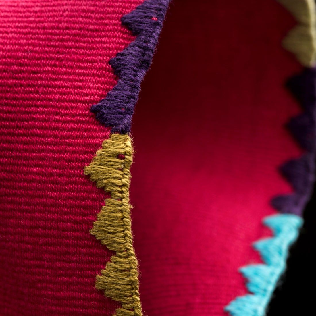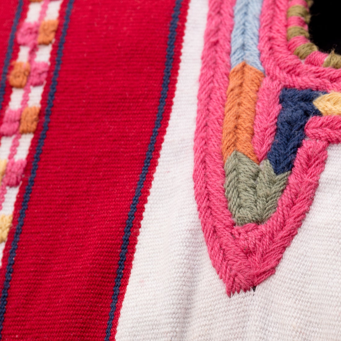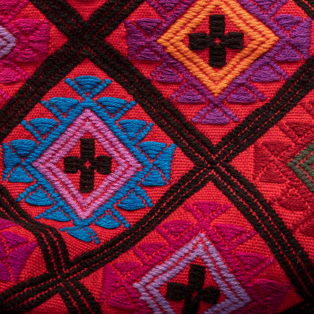 Oxchuc is both a city and larger municipality, located to the east of San Andrés in Los Altos de Chiapas. The indigenous Mayan citizens of Oxchuc speak Tzeltal, a close linguistic cousin to the Mayan dialect spoken by their Tzotzil neighbors. Artisans from San Andrés and Oxchuc also share a rich history in textile weaving on the backstrap loom. Traditional women’s huipiles from Oxchuc feature alternating red or purple and white woven stripes with multicolored rays embroidered around the neckline and blocks of contrasting color below. Contemporary huipil design in Oxchuc includes more complex embroidery, with additional detail added to vertical woven stripes and around the sleeves. More experimental, modern blusas substitute traditional, white backgrounds for base colors in bright reds and purple hues.